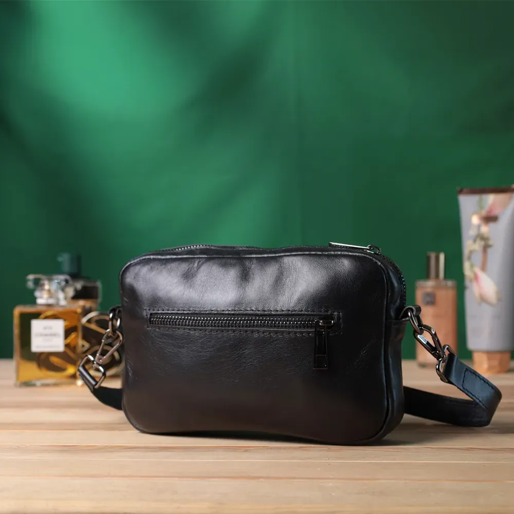 Цікава жіноча сумка, яку можна носити через плече як крос-боді, на плечі і як клатч в руках, для цього ремінець легко відстібається. Виріб виконаний у класичному чорному кольорі з гладкої з глянцевим блиском шкіри. Шкіра м'яка, приємна на дотик із високими показниками зносостійкості. Відмінний варіант як кожного дня, так і на вечір. Сумка добре тримає форму, має міцну підкладку, фурнітура срібного кольору – стійка не змінює свій колір у процесі носіння. Аксесуар чудово поєднується з усіма стилями в одязі та може стати чудовим подарунком на будь-яке свято.