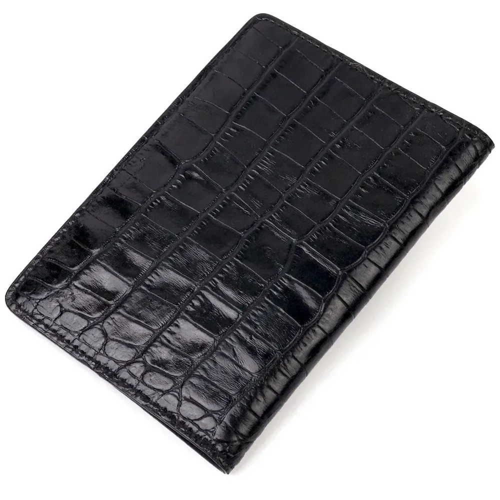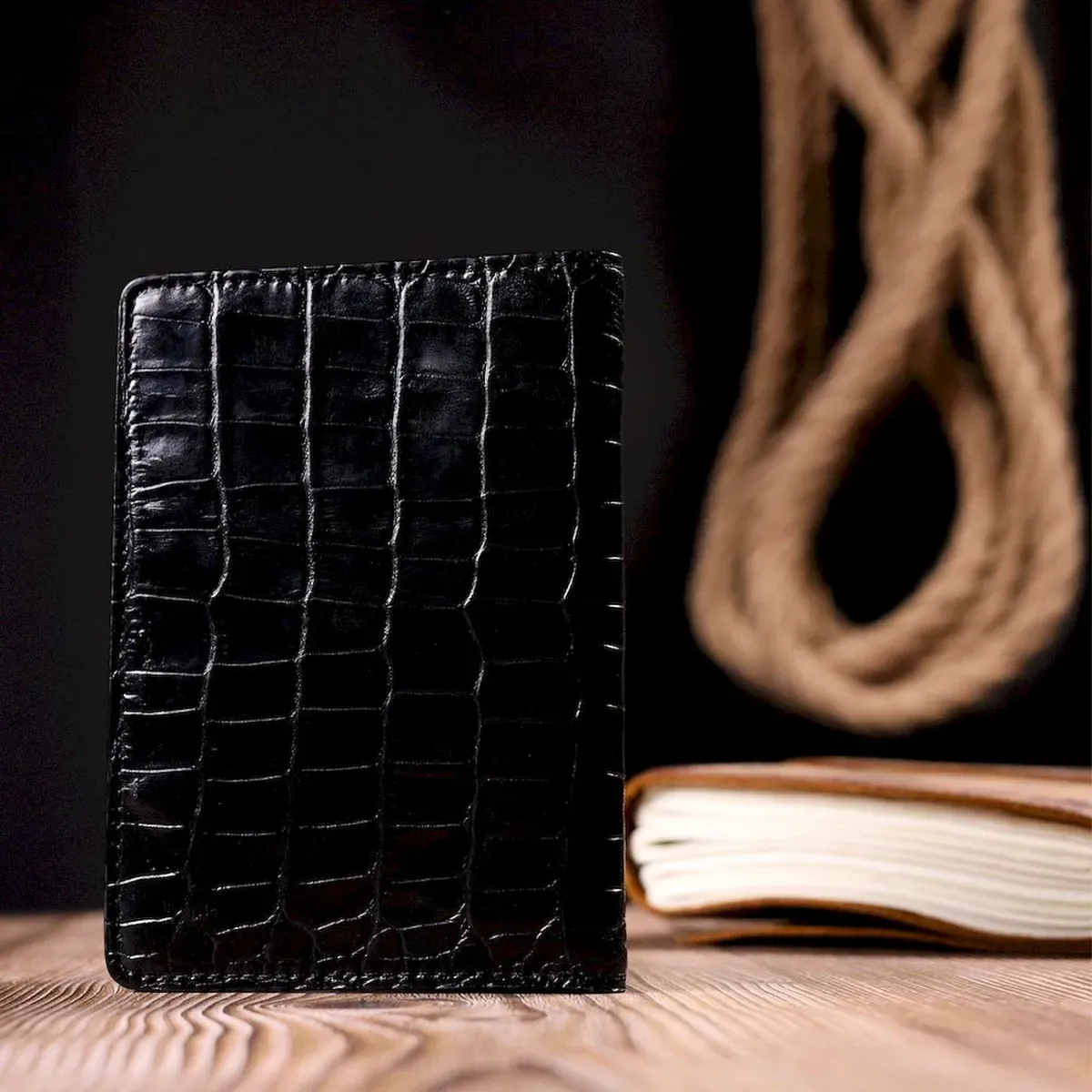 Красивая мужская обложка на паспорт, черного цвета из высококачественной лакированной кожи с тиснением под рептилию. Современный высококлассный аксессуар, который станет идеальным подарком для близкого человека по любому поводу. Обложка упакована в фирменную коробочку.