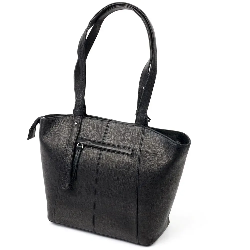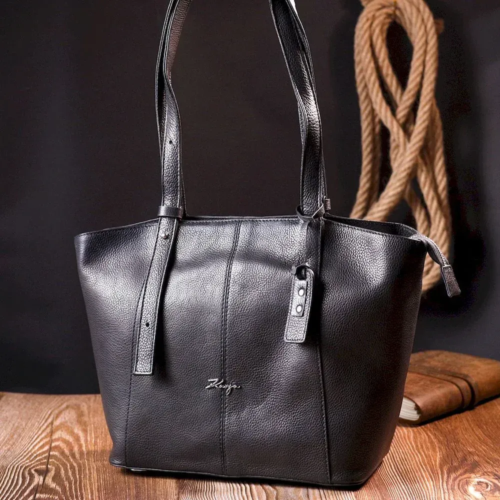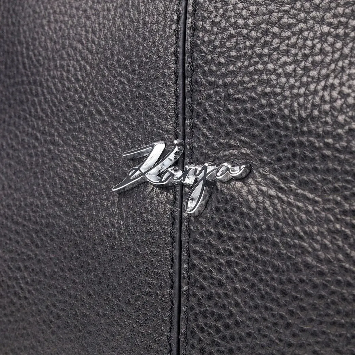 Стильная женская сумка из мелкозернистой натуральной кожи, в классическом черном цвете. Сумка функциональна и удобна в эксплуатации, качественная фурнитура не только дополняет стильный дизайн сумки, но и защищает изделие. Изделие имеет крепкую подкладку. Аксессуар упакован в фирменный текстильный мешок Karya. Сумка из натуральной кожи всегда будет отличным подарком любой женщине.