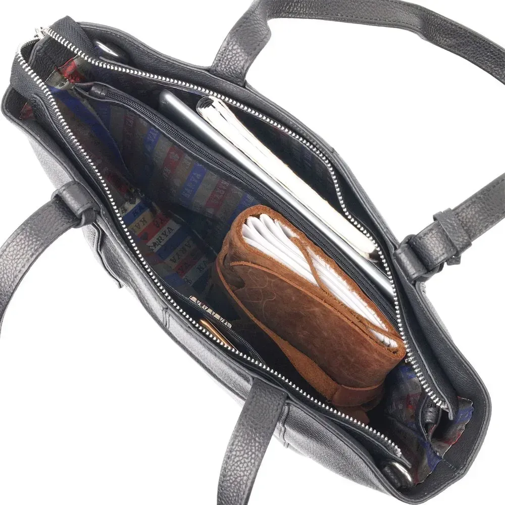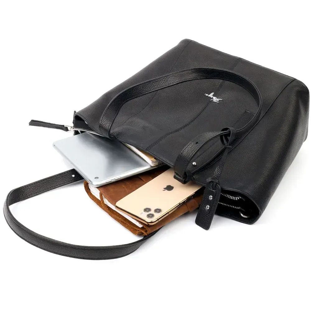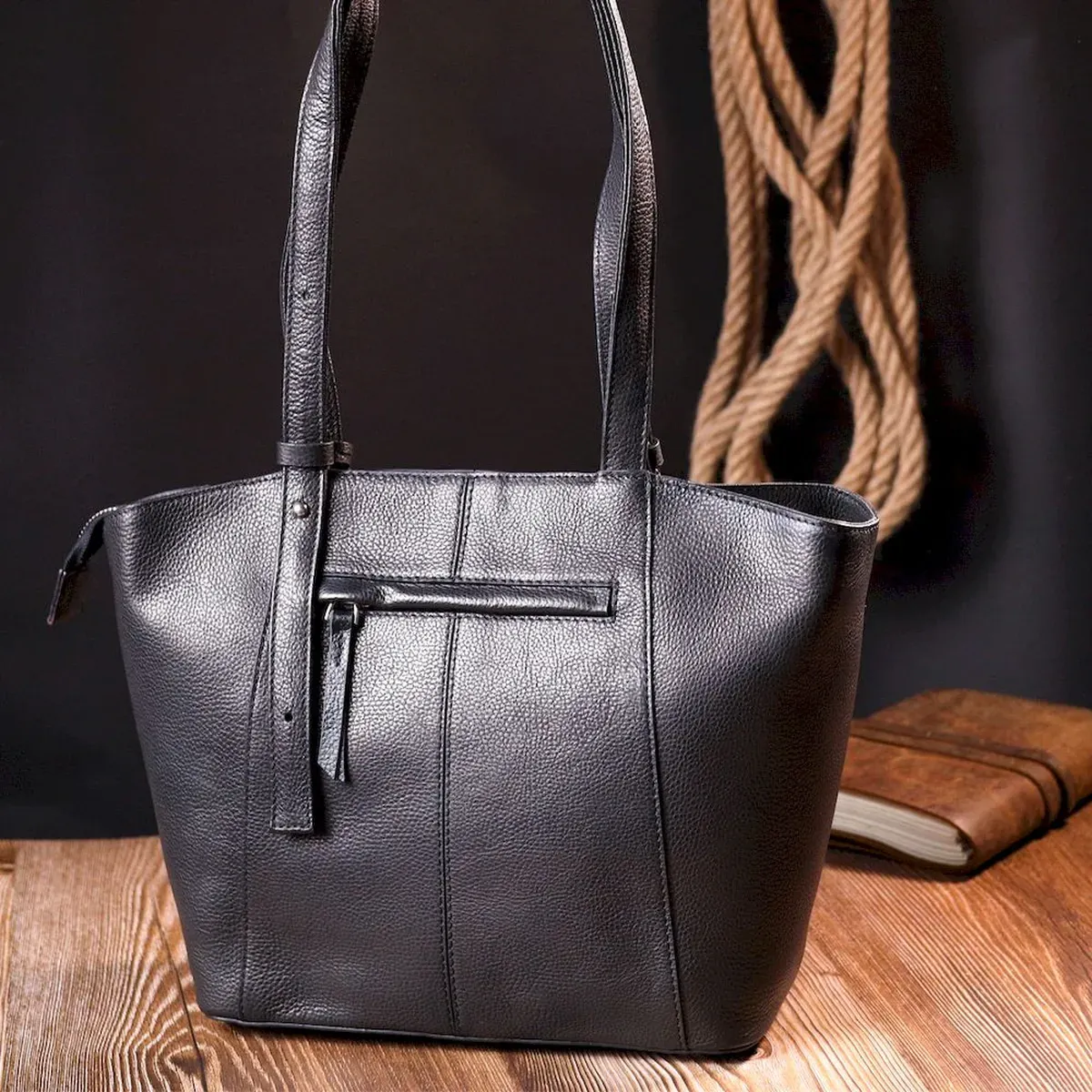 Стильная женская сумка из мелкозернистой натуральной кожи, в классическом черном цвете. Сумка функциональна и удобна в эксплуатации, качественная фурнитура не только дополняет стильный дизайн сумки, но и защищает изделие. Изделие имеет крепкую подкладку. Аксессуар упакован в фирменный текстильный мешок Karya. Сумка из натуральной кожи всегда будет отличным подарком любой женщине.
