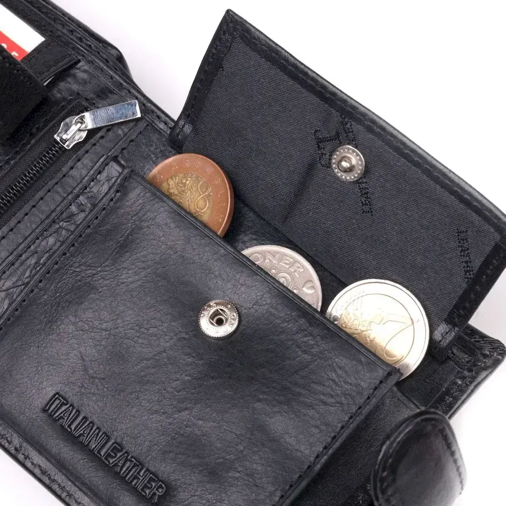 Практичный мужской кошелек среднего размера в два сложения из натуральной гладкой кожи. Для перегородки между отделениями используется натуральная кожа и прочный текстиль. Изделие состоит из трех больших отделений для купюр, двух потайных карманов, четырех прозрачных отделений, трех ячеек для карт и монетницы на кнопке. Ячейки для карт и прозрачные отделения располагаются в блоке, что закрывается на хлястик с кнопкой. Продается бумажник в красивой коробке от производителя. Закрывается кошелек хлястиком на кнопку.