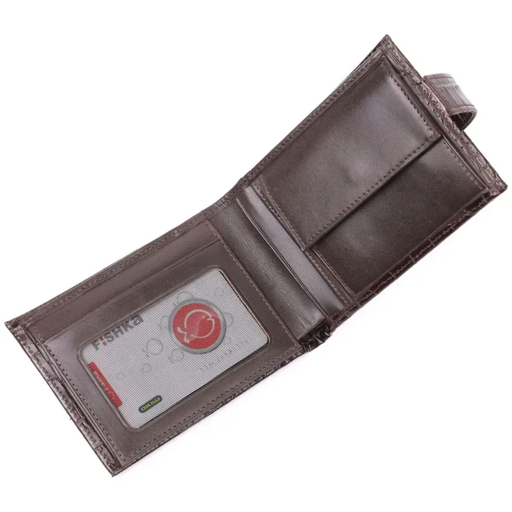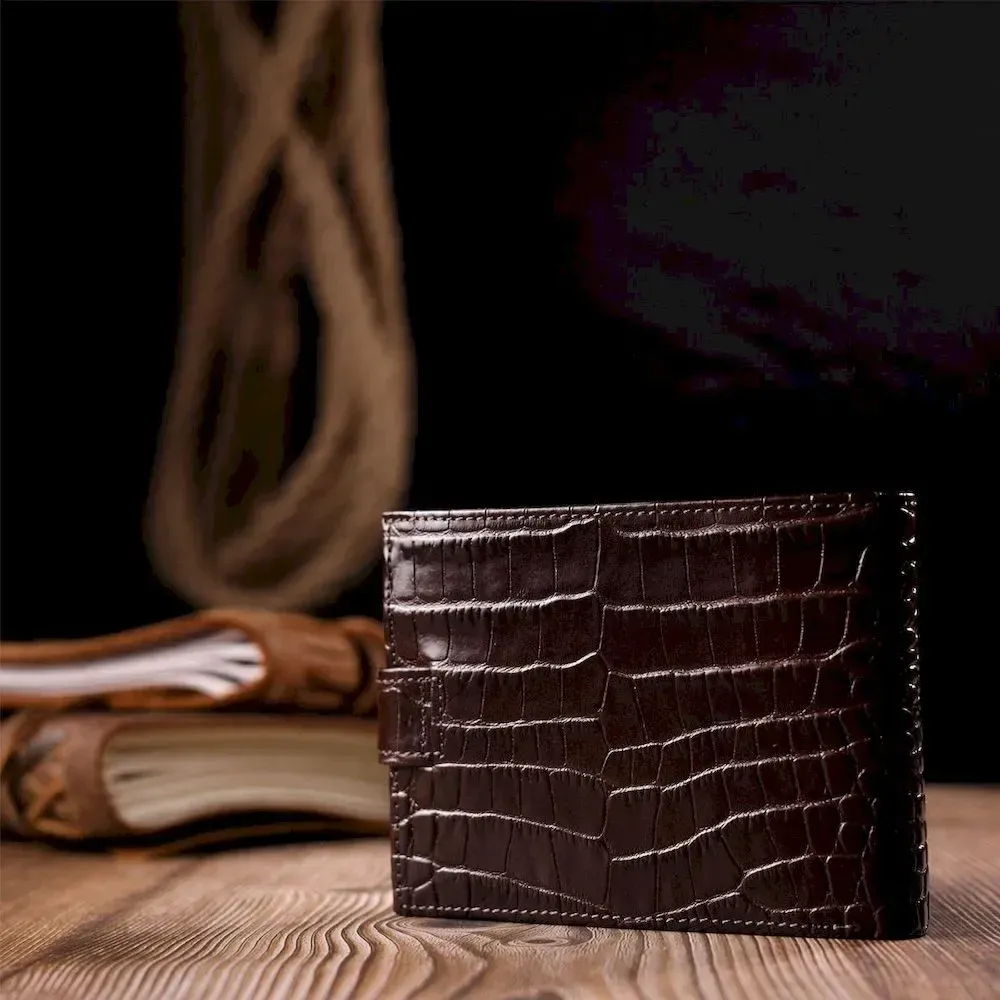 Небольшой мужской кошелек из натуральной кожи с тиснением под рептилию, в коричневом цвете. Изделие закрывается на хлястик с кнопкой . На лицевой стороне в виде декора расположен металлический логотип производителя. Аксессуар упакован в фирменную коробочку. Изделия из натуральной кожи всегда будут отличным подарком для близкого человека.