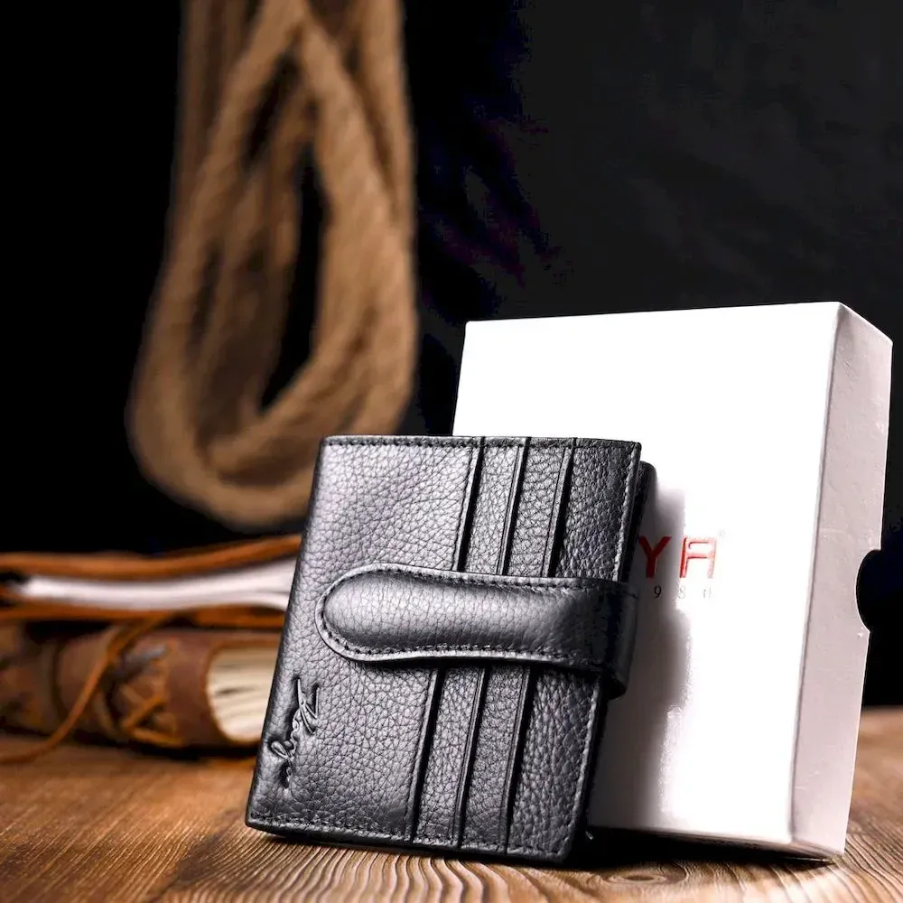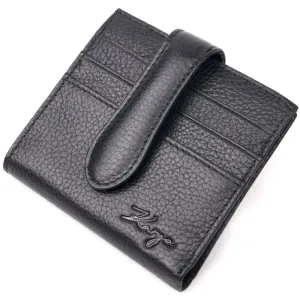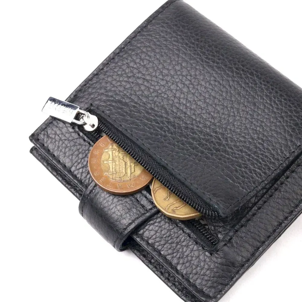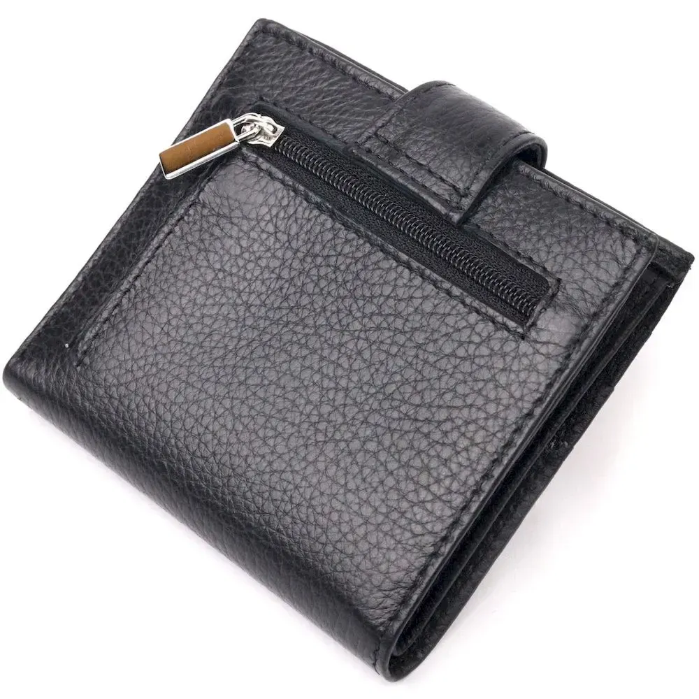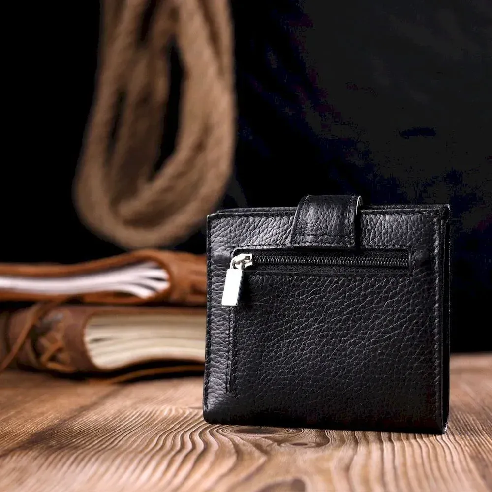 Небольшой женский кошелек из натуральной кожи высокого качества, в классическом черном цвете. Внутри есть отделения для купюр и ячейки для кредитных карт. В изделии использована качественная фурнитура, а также прочная фирменная подкладка. Не большой кожаный кошелек поместится даже в самую маленькую сумочку. Закрывается модель на кожаный хлястик с кнопкой. Такой кошелек, однозначно, порадует любую женщину.