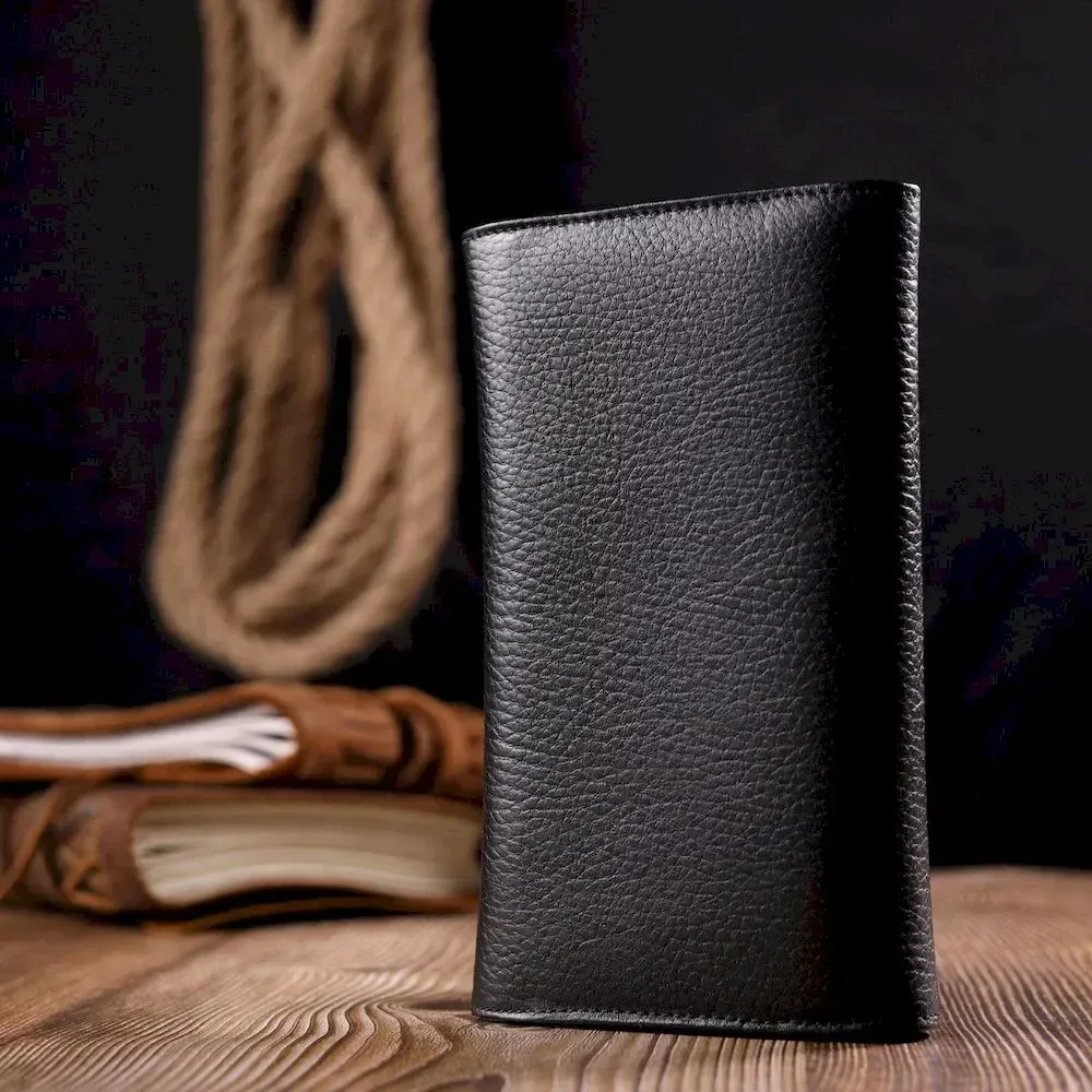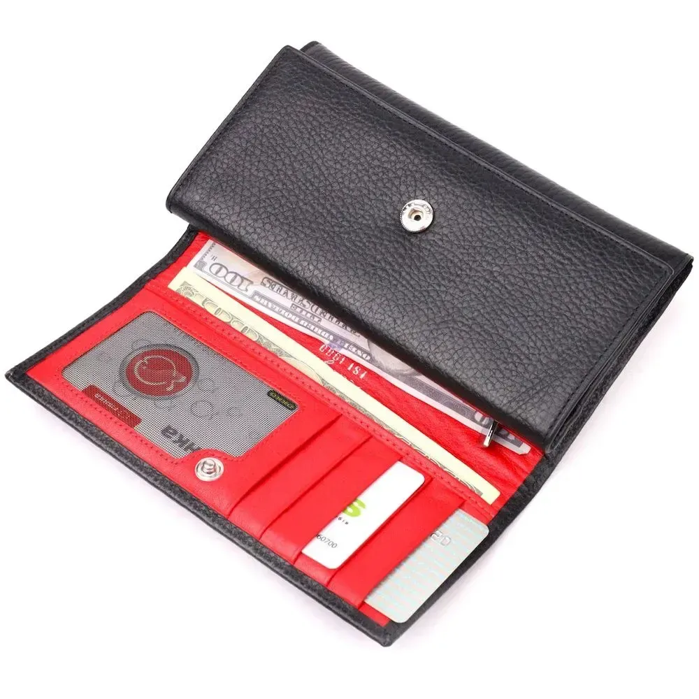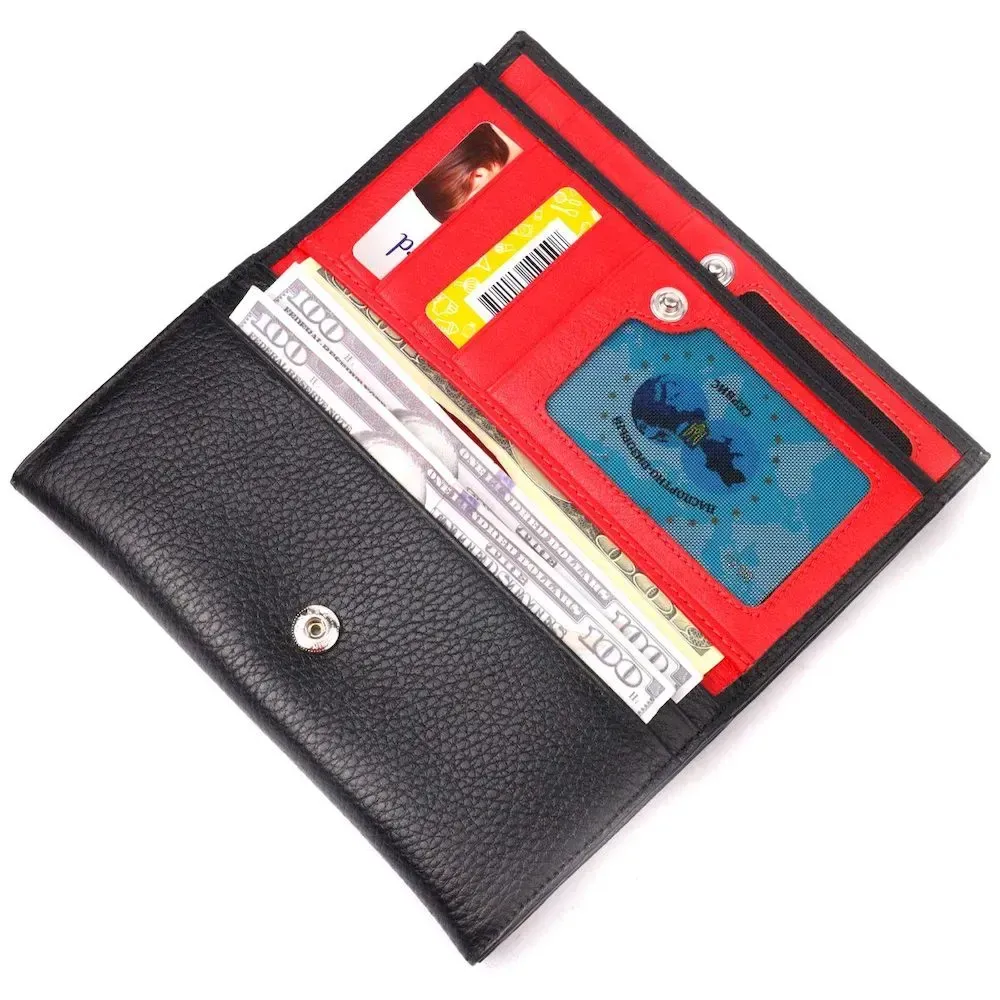 Прекрасный женский кошелек из натуральной зернистой кожи, в красивой комбинации цветов, снаружи – черный, внутри - красный. Изделие состоит из двух автономных отделений, которые закрываются клапанами на кнопку. Внутри представлено множество карманов, в которых можно удобно разложить купюры, пластиковые карточки и документы. Такой кошелек из натуральной кожи - это идеальный вариант на каждый день для тех, кто ценит качество, удобство и комфорт, а также будет отлично дополнять Ваш повседневный образ.