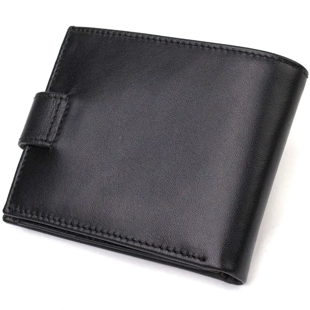 Красивое мужское портмоне небольшого размера из натуральной гладкой кожи. Аксессуар имеет основное отделение для купюр с перегородкой, три ячейки для карточек, два карманы под сеточкой, два прилегающих кармана и монетницу. Кошелек складывается пополам, закрывается хлястиком на кнопку. На лицевой стороне в правом нижнем углу, расположен металлический логотип компании производителя. Многофункциональный мужской бумажник из очень прочной кожи отличный выбор подарка для солидного мужчины.