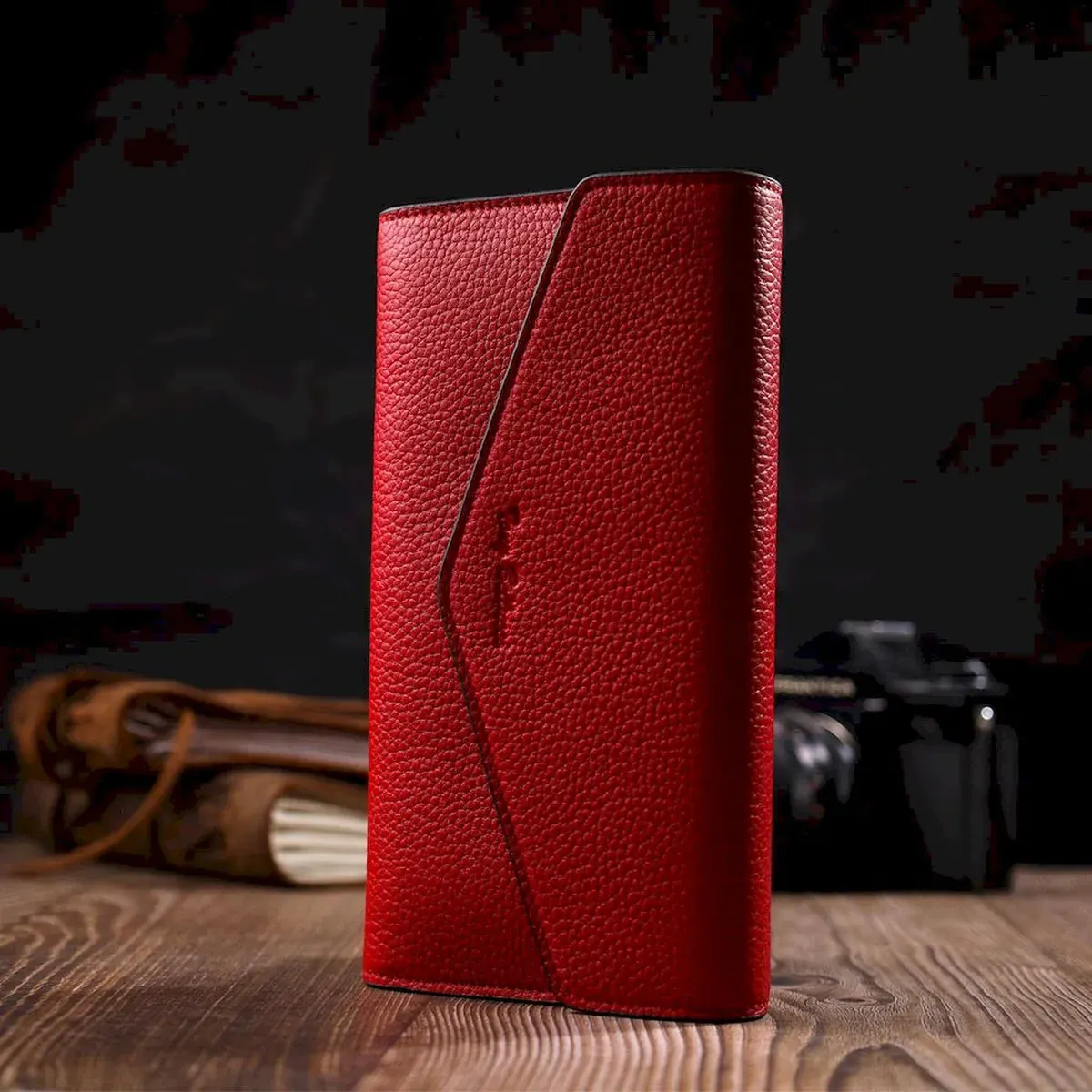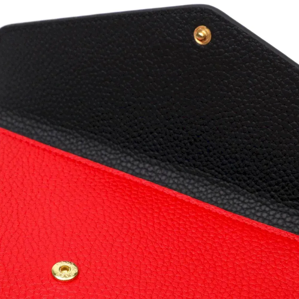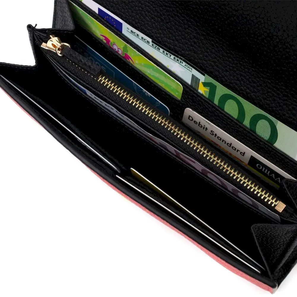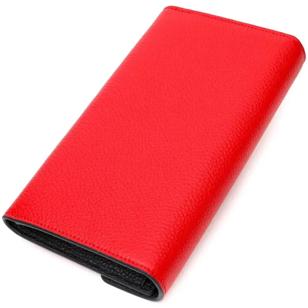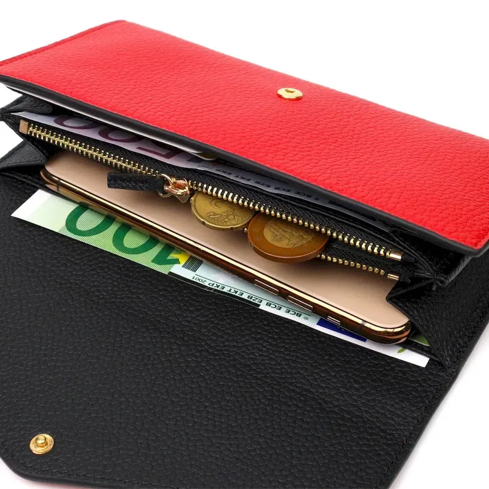 Стильный вместительный женский кошелек из натуральной кожи, в комбинации из двух цветов красного снаружи и черного внутри. Аксессуар состоит из двух широких отделений для купюр, двенадцати ячеек для пластиковых карт, двух прилегающих карманов и монетницы на молнии. В изделии использована качественная фурнитура золотистого цвета. Закрывается кошелек треугольным клапаном на кнопку. Покупая этот кожаный кошелек, Вы не только приобретаете стильную вещь, но и получаете качественный аксессуар, который прослужит не один год.