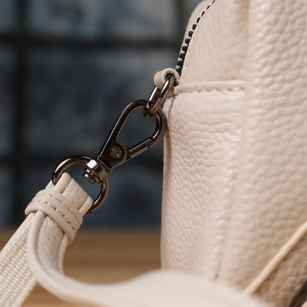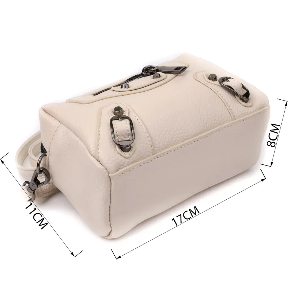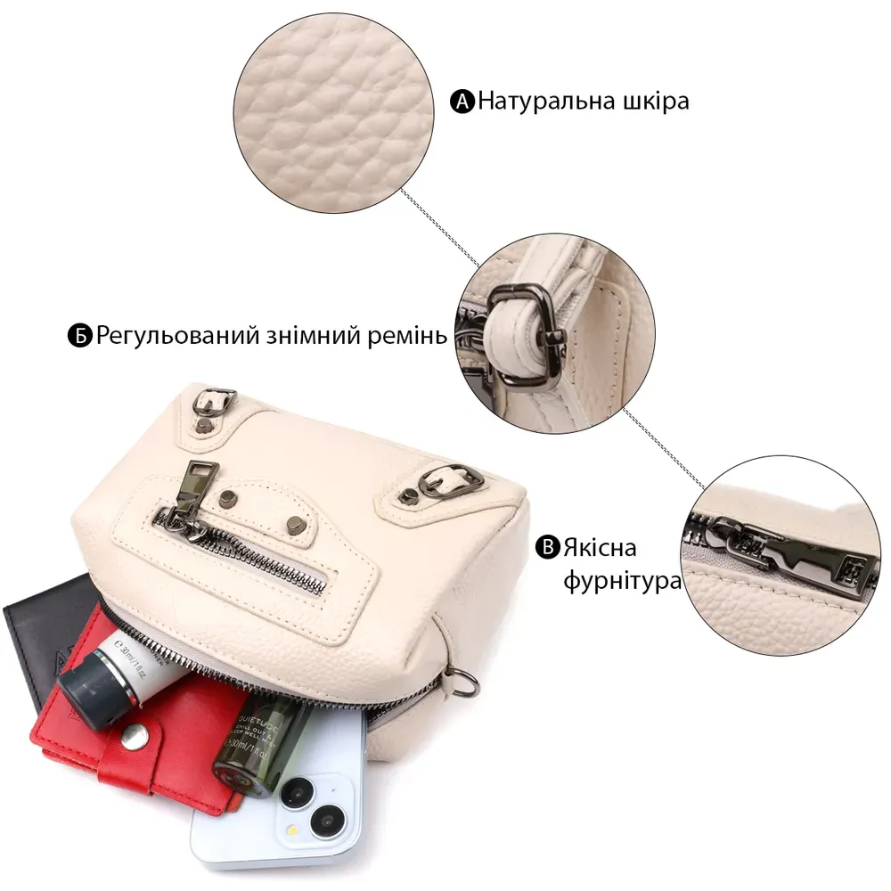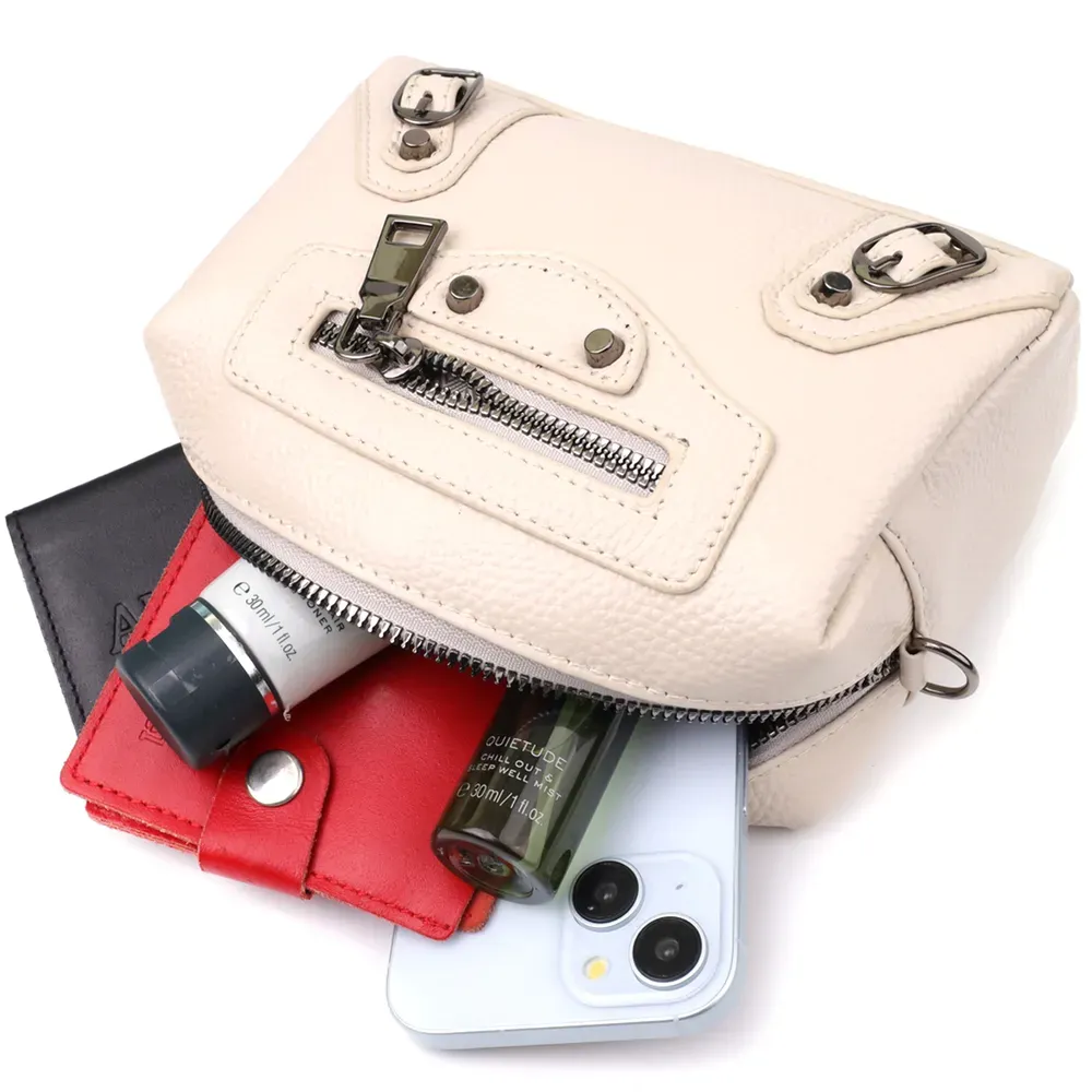Ідеальний вибір для тих, хто цінує сміливі акценти та практичний формат – біла шкіряна сумка з декоративним оздобленням стане виразною деталлю у будь-якому образі, від casual до міського шику.