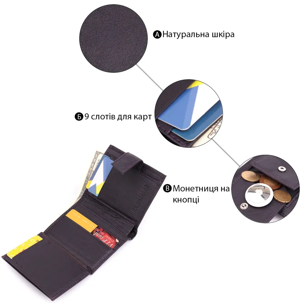 - 9 відділень для пластикових карток, одне з них прозоре;