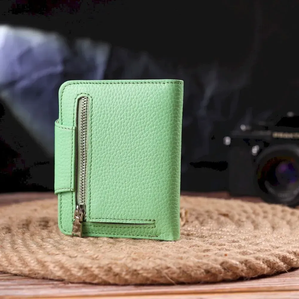 Небольшой женский кошелек, из натуральной кожи, в красивом салатовом цвете. Аксессуар имеет отделение для купюр, монетницу, что закрывается на молнию, три скрытых кармана и четыре отсека для карточек, один под сеточкой. Закрывается аксессуар клапаном на кнопку. Качественный кожаный аксессуар всегда считался показателем вкуса и достатка, именно такие изделия представлени в нашем магазине, у нас каждый найдет что-то для себя.