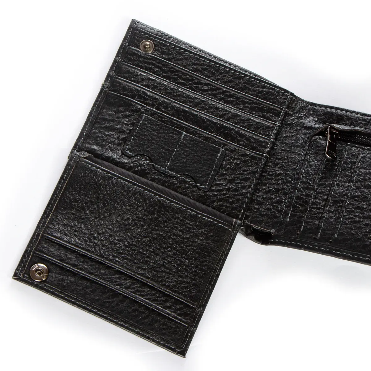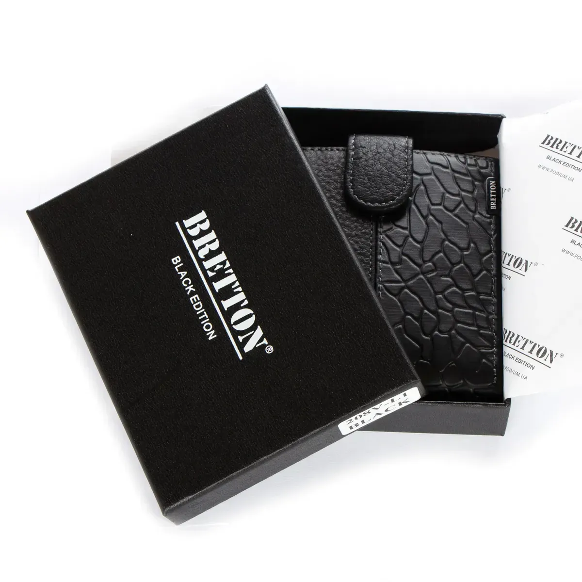 Мужской кожаный кошелек Bretton, серия Black Edition. Изготовлен из мягкой натуральной кожи. Внутри есть: два открытых отделения для банкнот, 7 карманов для визитных карт на откидном блоке и монетница на молнии.