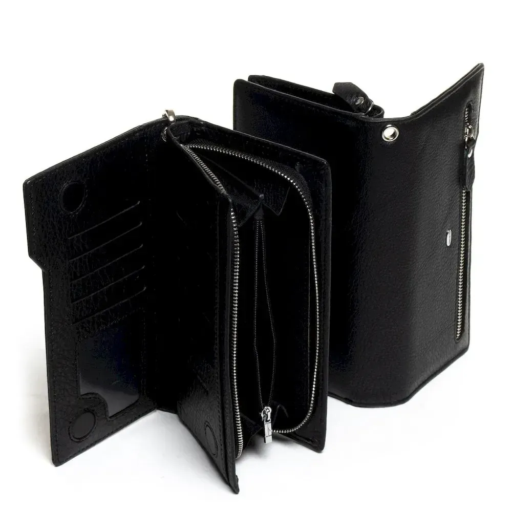 Большой кожаный кошелек Dr.Bond. Изготовлен из мягкой натуральной кожи. Переднее отделение закрывается на магнитные кнопки. Внутри находятся 11 карманов для визитных карт и 2 больших открытых кармана. Снаружи находится двойное отделение для банкнот, разделенное карманом-монетницей на молнии. На фасаде кошелька расположен большой карман на молнии. В комплекте есть съемная кистевая ручка.