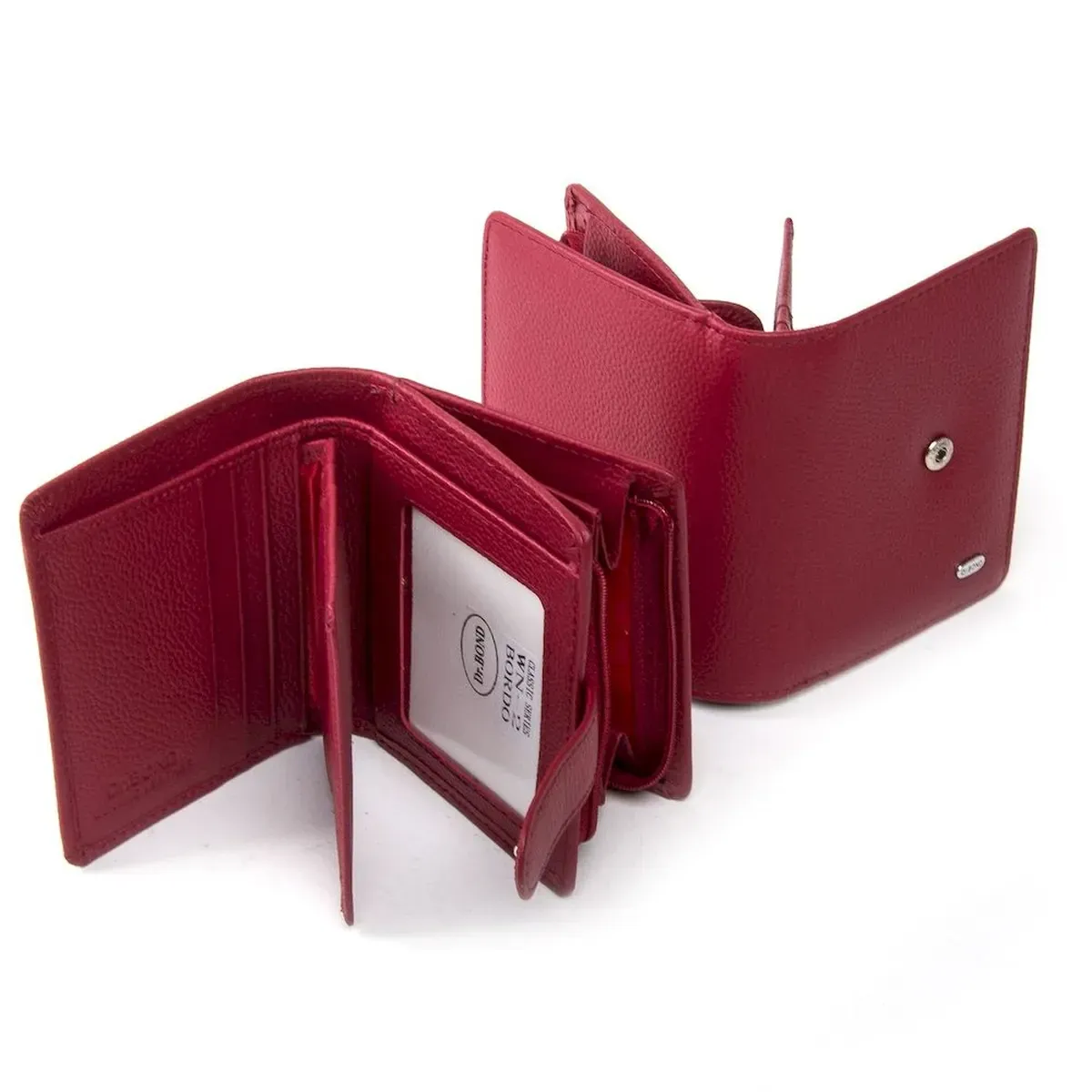 Женский кошелек Dr.Bond. Изготовлен из натуральной мягкой кожи с естественной текстурой. Основное отделение закрывается клапаном на кнопке. Внутри находится одно открытое отделение для банкнот, 10 карманов для визитных карт и 1 прозрачный кармана. Снаружи кошелька на обратной стороне находится двойная монетница на молнии.
