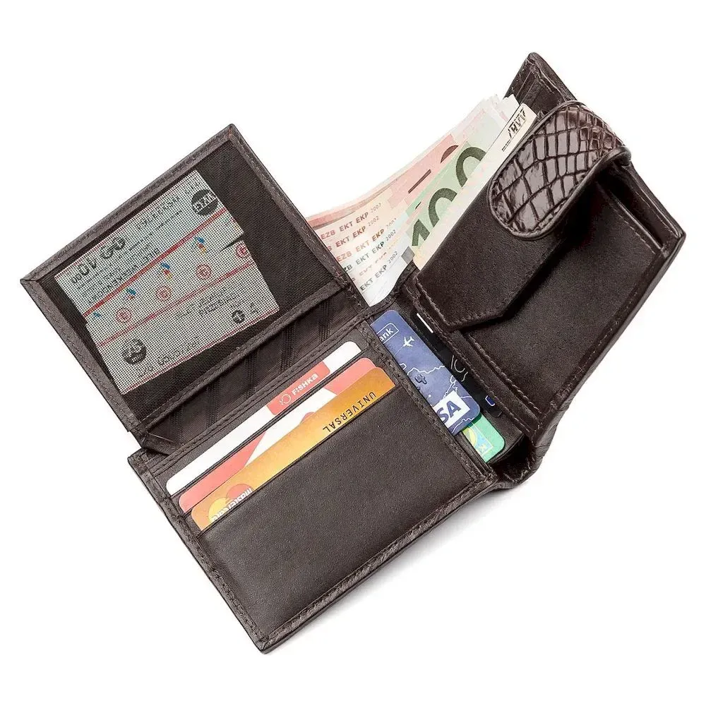 Стильный кошелек из натуральной кожи крокодила, фактурной и приятной на ощупь. Аксессуар обшит качественной гладкой кожей в тон кошелька. Изделия из кожи крокодила всегда считались большой роскошью, так как в мире не так уж много компаний, которые занимаются выделкой такой кожи, поскольку этот процесс действительно чрезвычайно трудоемкий. Экзотические изделия из крокодила действительно неповторимы так, как не найти двух одинаковых крокодилов и невозможно создать идентичные вещи. Каждое изделие из этого материала обладает своей уникальной структурой и узором. Изделия из кожи крокодила будут отличными подарками для Вас и Ваших близких.