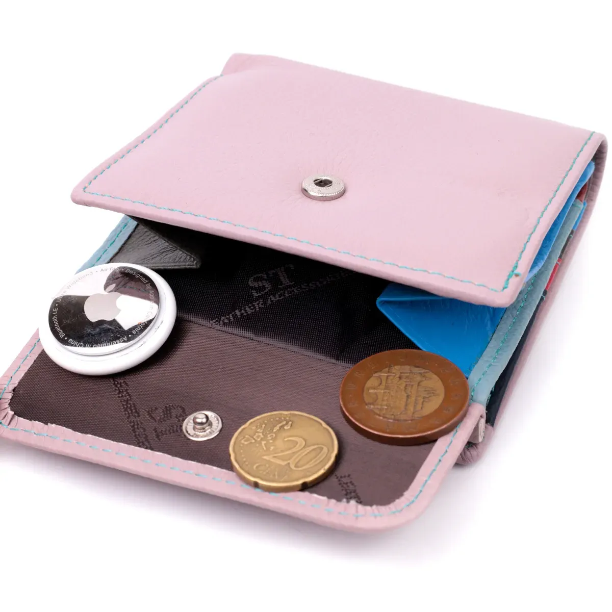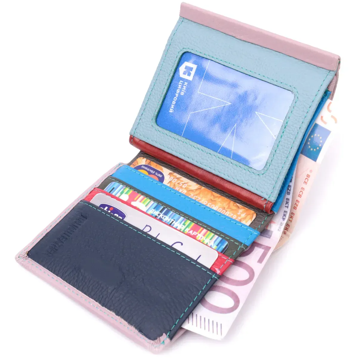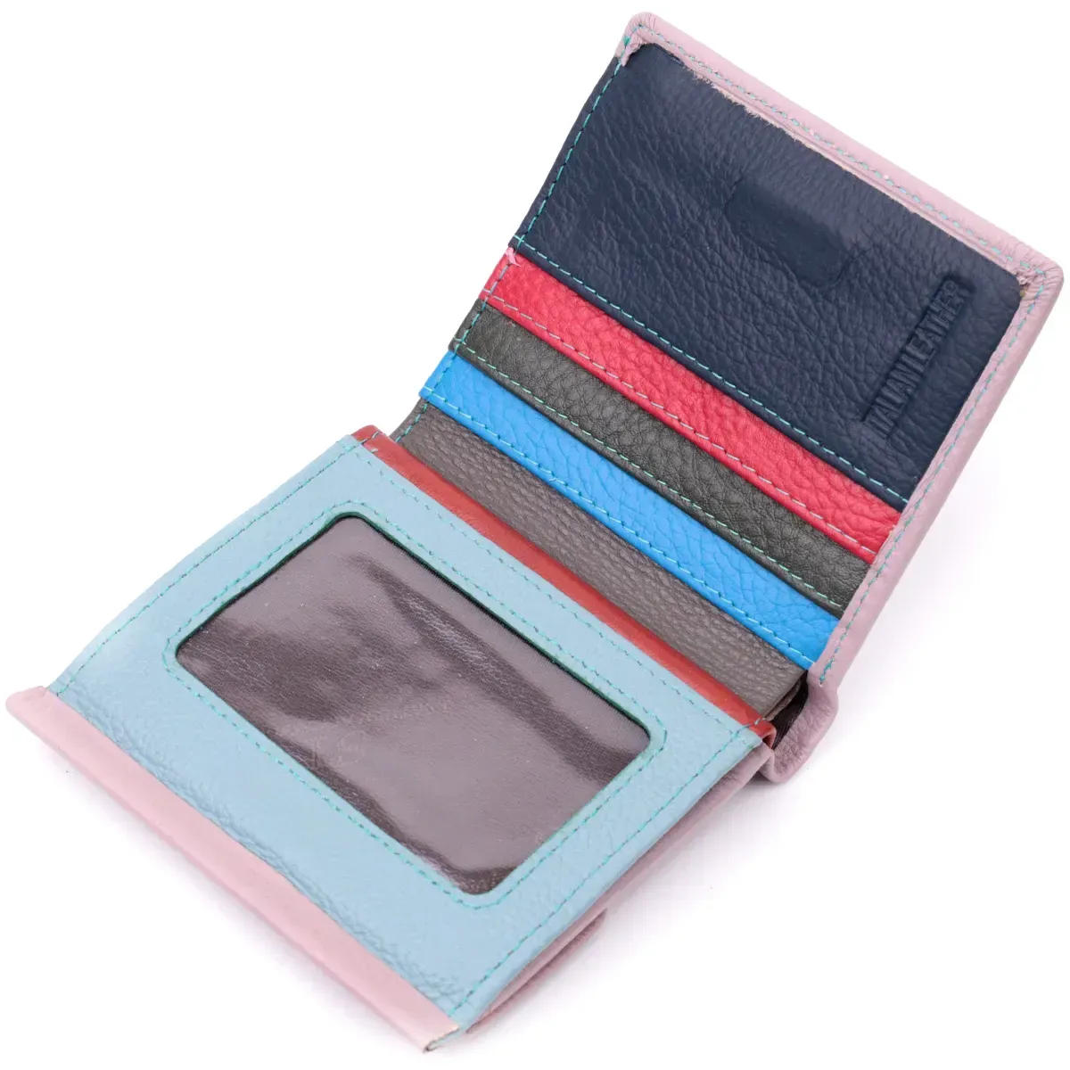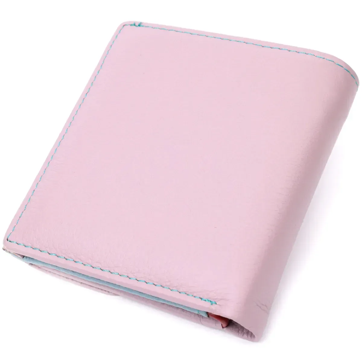 Необычное цветное портмоне для женщин среднего размера из натуральной кожи высочайшего качества. Акцентом этого кошелька является цвет, точнее несколько цветов - он бежево-розового цвета снаружи и многоцветный внутри. Аксессуар состоит из двух вместительных отделений для купюр, кармана на молнии, четырех ячеек для карт, скрытого кармана, прозрачного кармана и кармана для монет. Снаружи изделие прошито ровной строчкой бирюзового цвета по краю и украшено металлическим логотипом компании производителя, который размещен вверху посередине. Портмоне дополнено надежной фурнитурой и крепкой подкладкой. Укомплектован кошелек в фирменную картонную коробку белого цвета.
