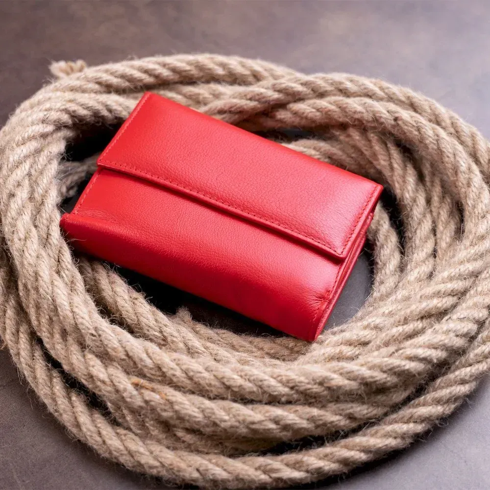 Горизонтальный кошелек на кнопках яркого красного цвета. Аксессуар имеет достаточно отделений для кредиток, а также слоты для удостоверений под пленкой. В такие ячейки поместятся права ид-карта, техпаспорт, пенсионное нового образца.