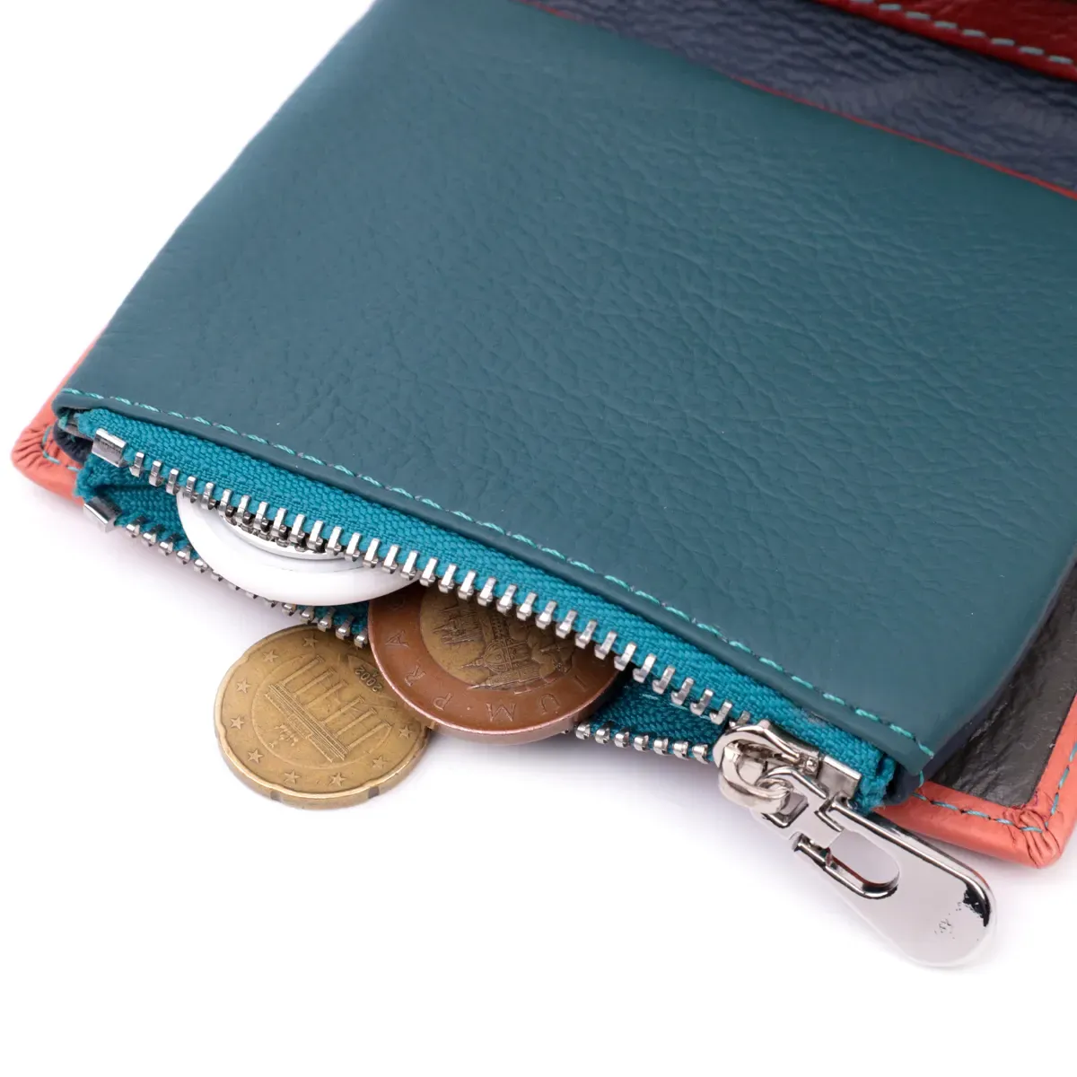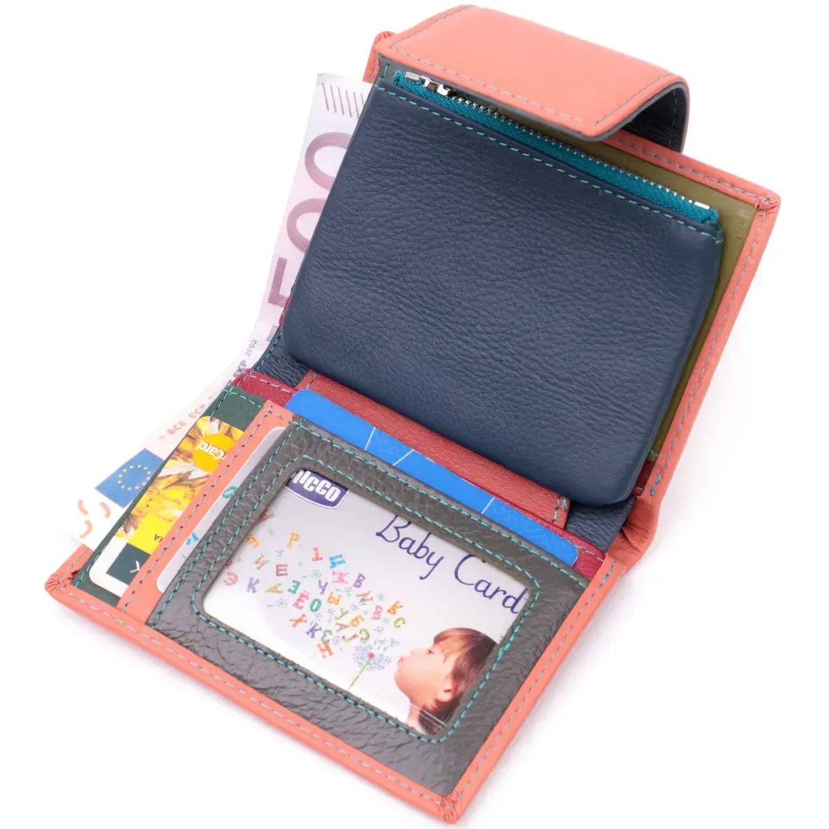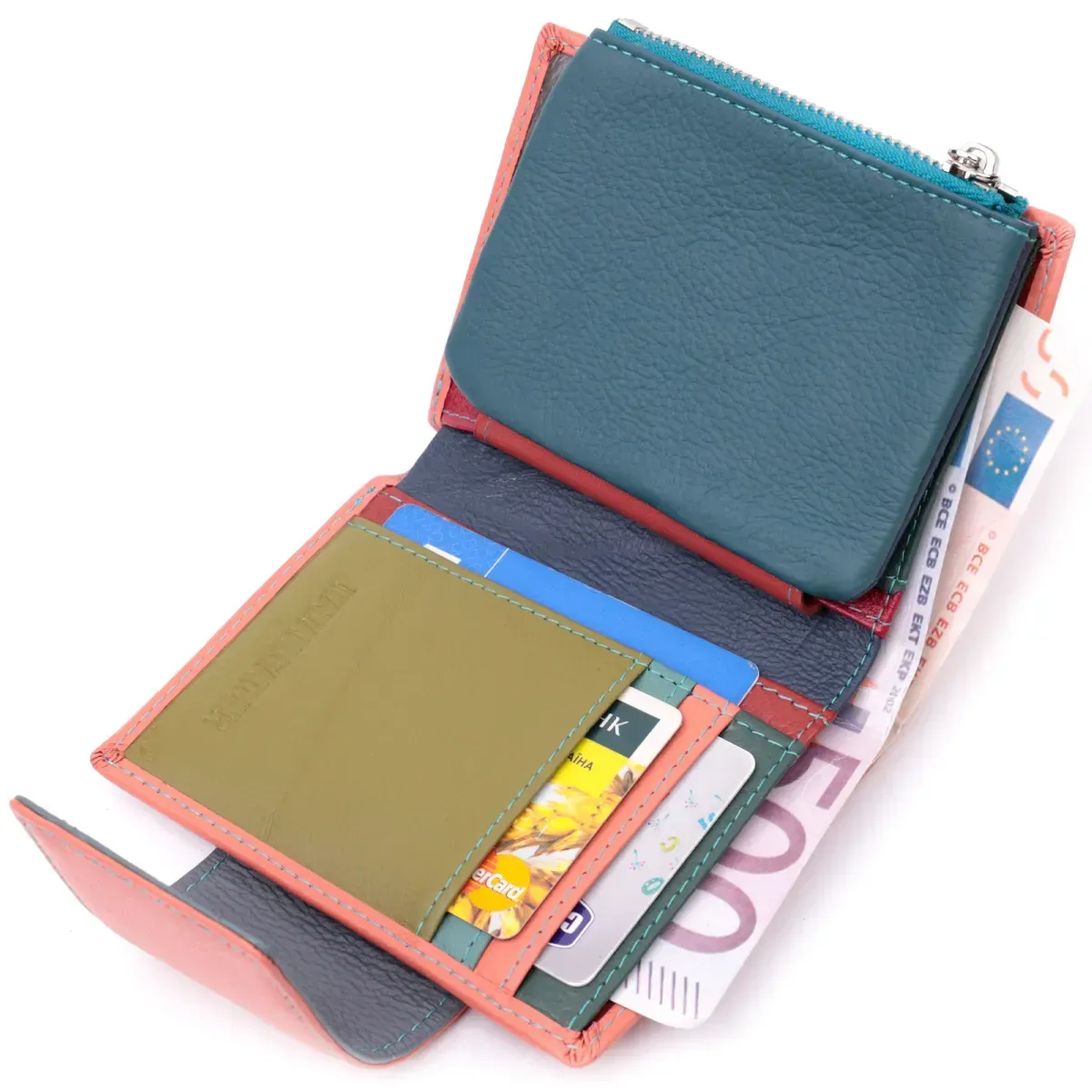 Вертикальное портмоне в два сложения удобного размера из натуральной кожи высочайшего качества. Кошелек оранжевого цвета с коралловым оттенком снаружи и разноцветный внутри, что очень стильно и современно. Кожаное портмоне очень практичное и служит достаточно долго. Аксессуар состоит из основного отделения с кожаной перегородкой для купюр, монетницы, четырех ячеек для карт, прозрачного окошка для пропуска и четырех скрытых карманов. Портмоне дополнено надежной фурнитурой и прошито по краю ровной строчкой бирюзового цвета. Укомплектован кошелек в фирменную картонную коробку белого цвета. Изделие станет идеальным подарком для девушки любого возраста.
