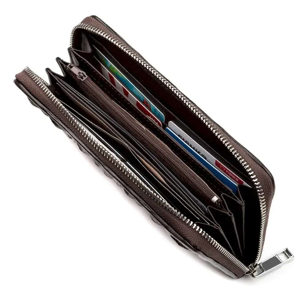 Кошелек-клатч из натуральной кожи крокодила, каждое изделие из этого материала обладает своей необычной структурой и неповторимым узором. В аксессуаре использована исключительно качественная фурнитура, серебряного цвета. Изделия из кожи крокодила всегда считались большой роскошью, так как в мире не так уж много компаний, которые занимаются выделкой такой кожи, поскольку этот процесс действительно чрезвычайно трудоемкий. Идеальный подарок для людей, которые любят все дорогое и оригинальное.
