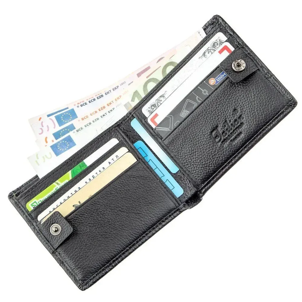 Простая и лаконичная модель мужского кошелька, выполненная из натуральной кожи высокого качества. Производство – фабричный Китай. Портмоне не имеет больших размеров, но при этом достаточно вместительное. Внутри кошелька есть несколько отделений для купюр и удобных ячеек для карточек. Закрывается портмоне на кнопку. Кошелек легко поместится в карман брюк или маленькую сумку.