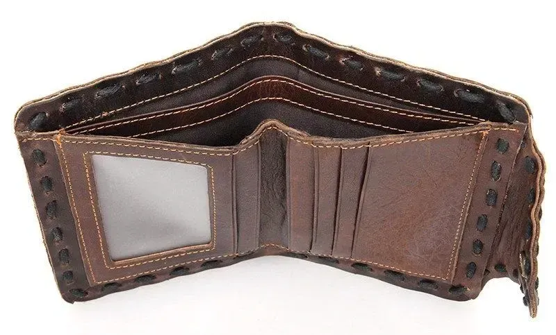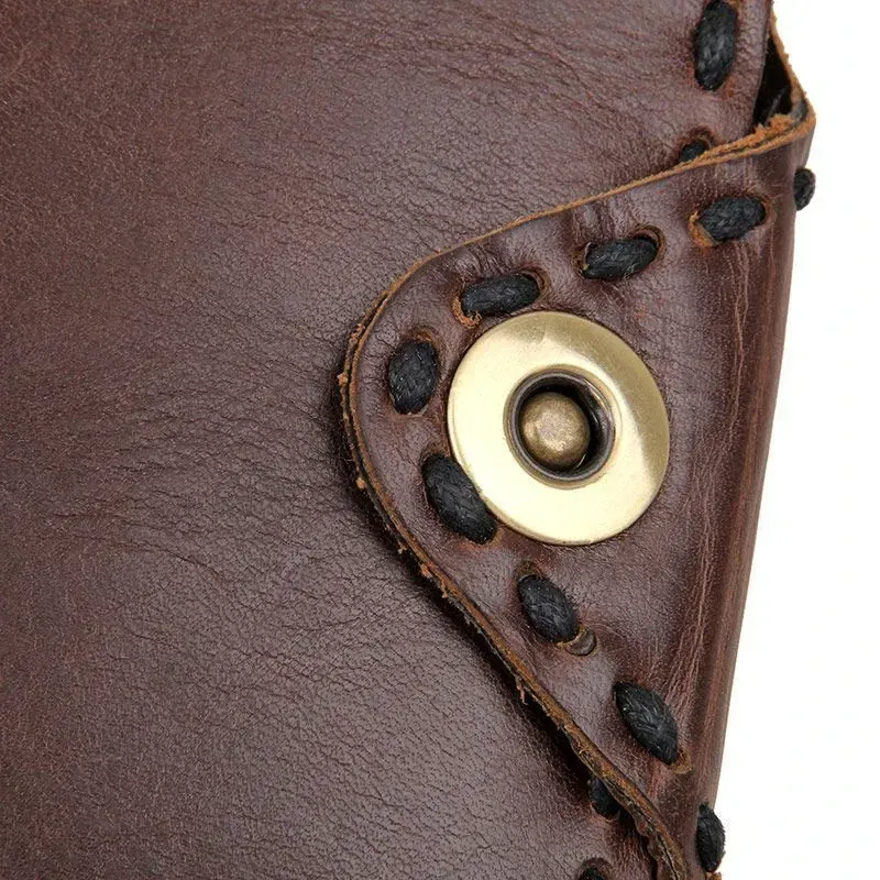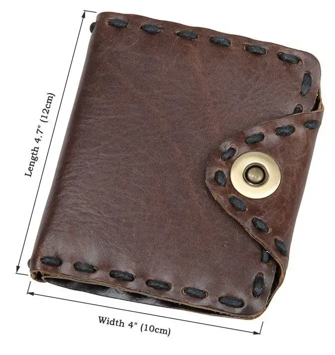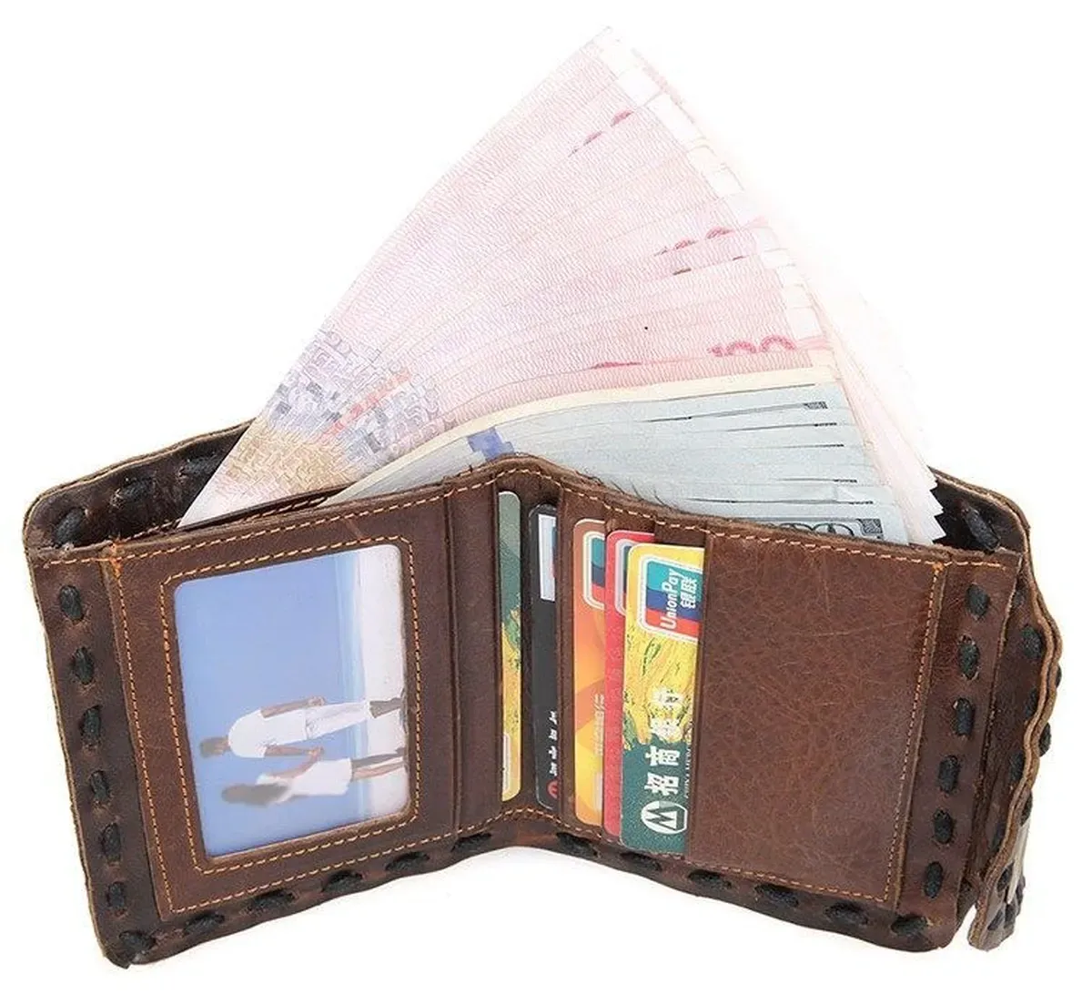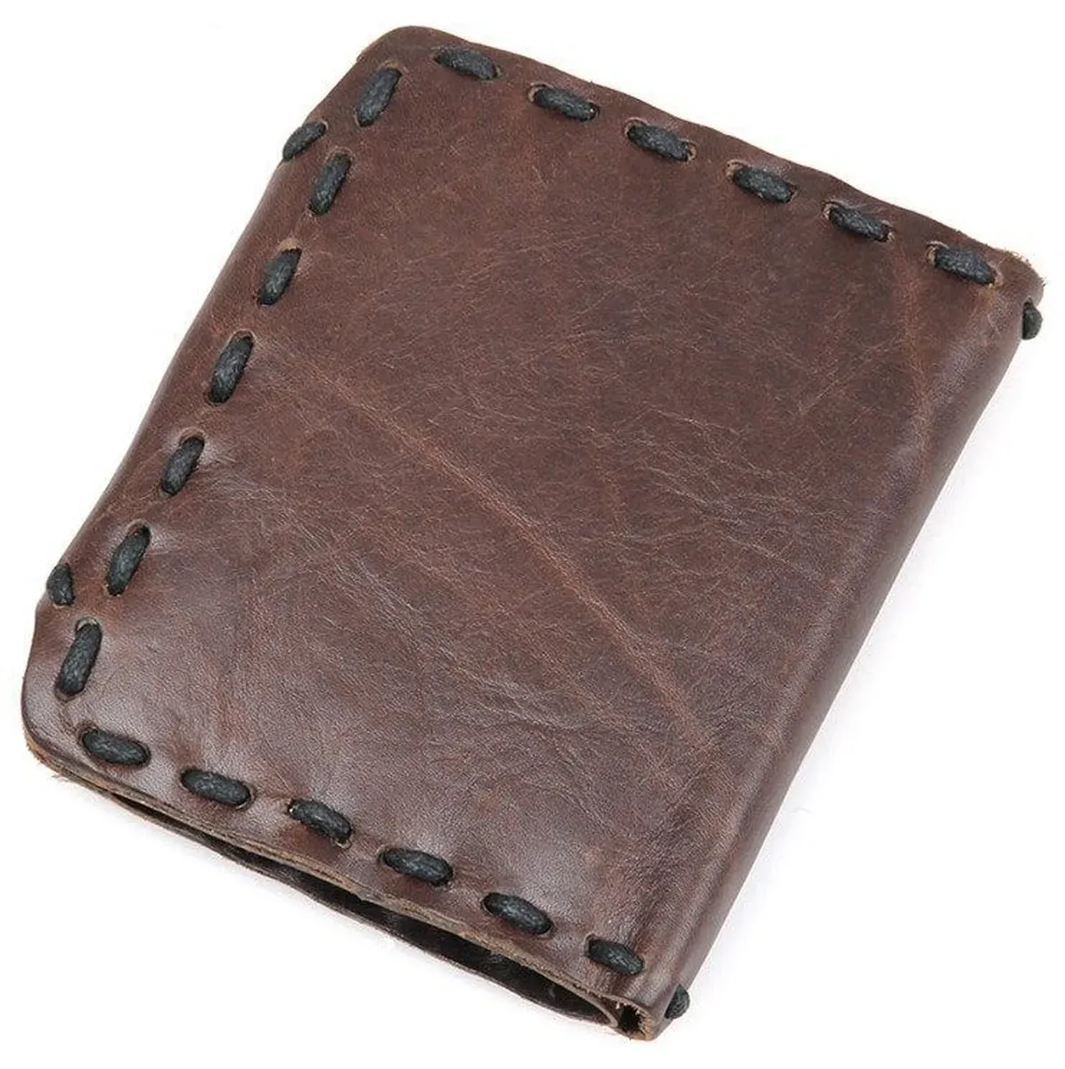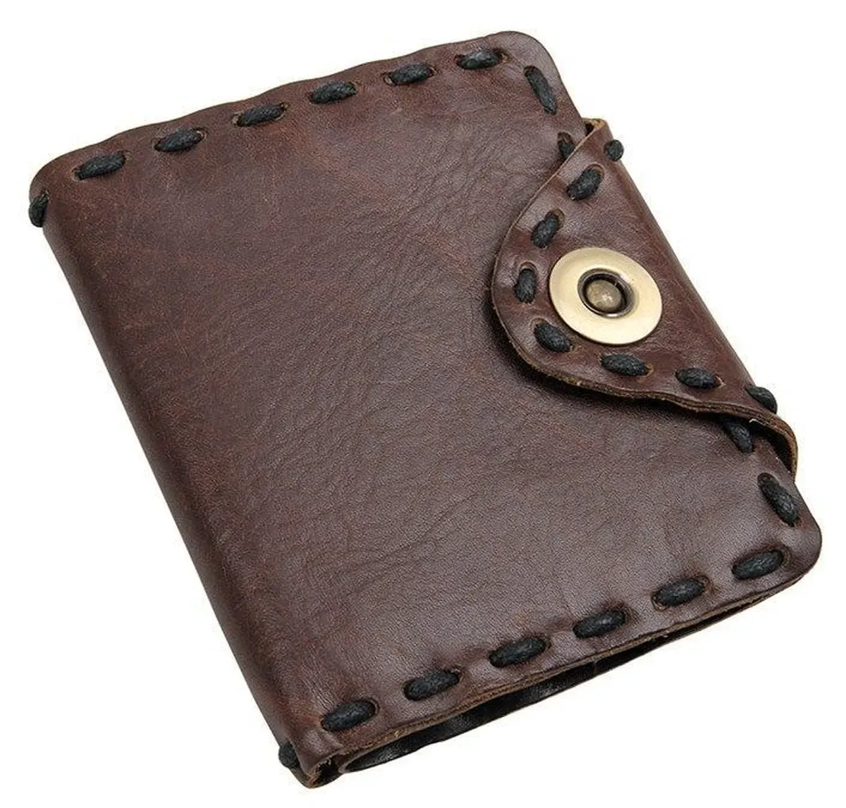 Эксклюзивный винтажный бумажник из натуральной кожи. Аксессуар закрывается при помощи кнопки. Цвет фурнитуры: латунь. Купюрник прошит толстой прочной нитью, которая также выступает элементом декора. Кошелек упакован в текстильный пылезащитный мешочек белого цвета.