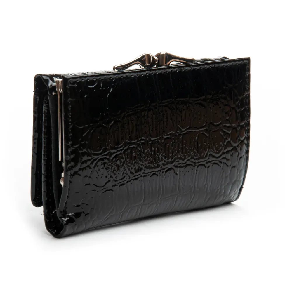 Изготовлен из лаковой кожи. Складывается втрое и закрывается на кнопку.