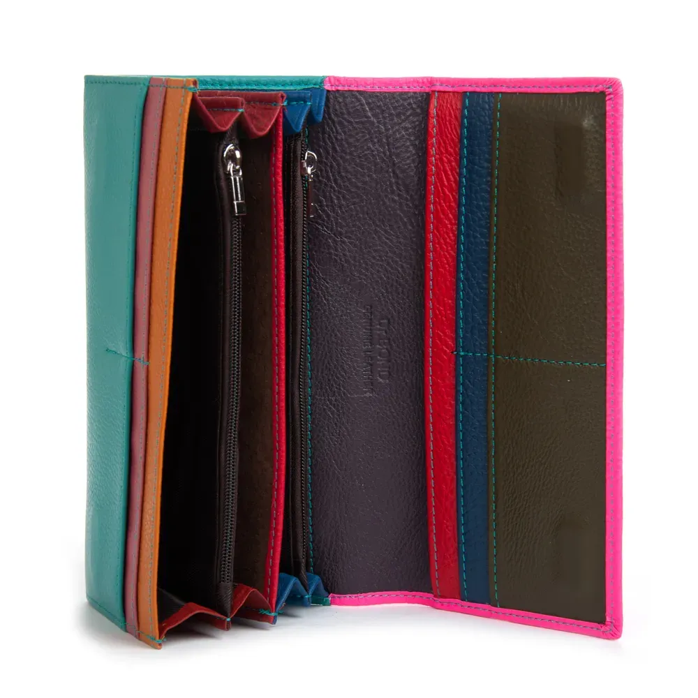 Внутри находятся 4 открытых отделения для банкнот, 2 больших кармана-монетницы на молнии, один большой открытый карман и 8 карманов для визитных карт. Снаружи кошелька на обратной стороне расположен карман на молнии.