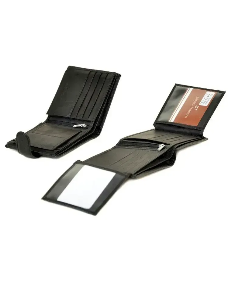 Мужской кошелек Sergio Torretti (ST). Наружная часть - искусственная кожа, внутренняя часть - натуральная кожа. Два отделения для банкнот. Внутри есть 2 разворота на которых размещены 12 карманов для визитных карт, два больших прозрачных кармана. Один карман на молнии и монетница на кнопке. Размер (см.) 12*10*2,5