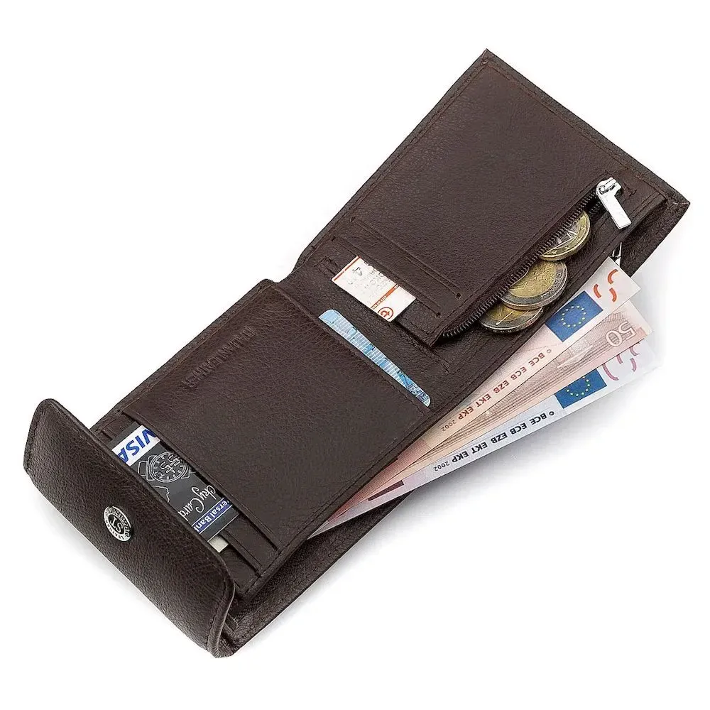 Портмоне для мужчин выполнено в сдержанном, педантичном стиле. Изделие оснащено кнопочной фиксацией. Благодаря внутреннему развороту, можно быстро достать содержимое. Кошелек оснащен двумя отделениями для купюрохранения, одно из которых закрывается молнией. В нем есть ячейки для хранения кредиток, визиток и прочих карт. Изнаночная сторона украшена фирменным значком и аккуратной кромочной строчкой. Изготовлен аксессуар из говяжьей и свиной кожи с текстильной подкладкой.