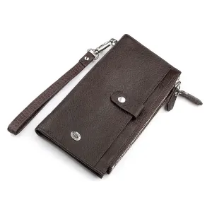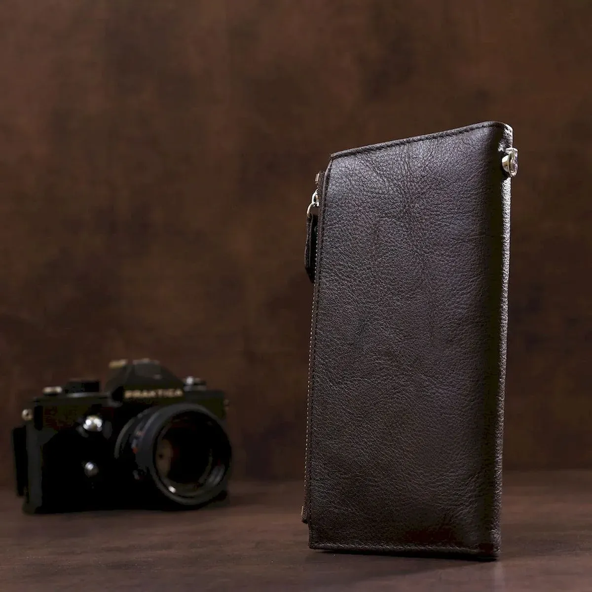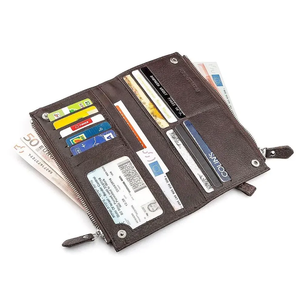 Прекрасная модель производится с прочной говяжьей кожи и фиксируется на две кнопки. Внутри есть достаточно отделений для бумажных купюр и ячеек для пластиковых карт, с прозрачным окошком для фотографий или разных документов. Дополнительно модель укомплектована симметричными карманами, закрывающимися на кнопку и удобным ремешком на запястье.