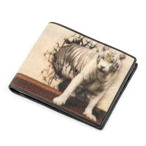 Вместительный кошелек из натуральной кожи морского ската, очень стойкой к износу, проколам, порезам, к разрывам и даже к огню. Аксессуар обшит черной гладкой натуральной кожей. Все пространство кожи покрыто сотнями мелких бугорков, разного размера, которые играют на свету, как небольшие бусинки. Внешний вид аксессуара, декорированный красивым рисунком тигра, с двух сторон. Стильный аксессуар, который прослужит очень долго и отлично подчеркнет стиль и статус своего владельца.