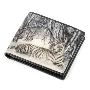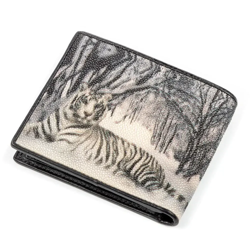 Модный кошелек из натуральной кожи морского ската, очень стойкой к износу, проколам, порезам, к разрывам и даже к огню. Аксессуар обшит черной гладкой натуральной кожей. Все пространство кожи покрыто сотнями мелких бугорков, разного размера, которые играют на свету, как небольшие бусинки. Внешний вид аксессуара, декорированный красивым рисунком тигра, с двух сторон. Стильный аксессуар, который прослужит очень долго и отлично подчеркнет стиль и статус своего владельца.