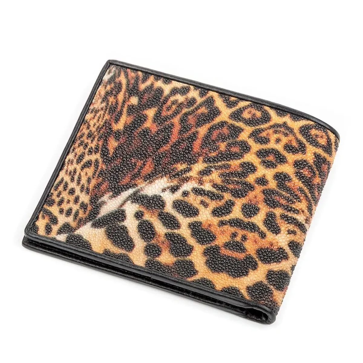 Износостойкий кошелек из натуральной кожи морского ската, очень стойкой к износу, проколам, порезам, к разрывам и даже к огню. Аксессуар обшит черной гладкой натуральной кожей. Все пространство кожи покрыто сотнями мелких бугорков, разного размера, которые играют на свету, как небольшие бусинки. Внешний вид аксессуара, декорированный красивым тигровым принтом. Стильный аксессуар, который прослужит очень долго и отлично подчеркнет стиль и статус своего владельца