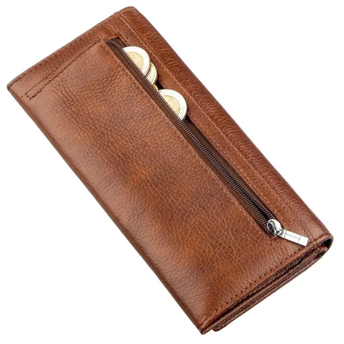 Презентабельный женский кошелек-визитница с оригинальным и практичным дизайном. Идеально подойдет для женщин, которые ценят оптимальное соотношение красоты внешнего вида и функциональности. Материал изготовления – первоклассная высококачественная кожа с зернистой и мягкой фактурой. Также следует сказать, что кожа имеет высокие эксплуатационные показатели. Цвет изделия – коричневый, который на вид смотрится очень интересно и шикарно. Визуально кошелек можно разделить на три части – это основное отделение, визитница и монетница. Отделения эти практичные и вместительные, закрываются на кнопки, а монетница – на молнию. Упакован аксессуар в белую картонную коробку.