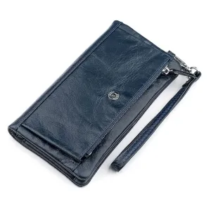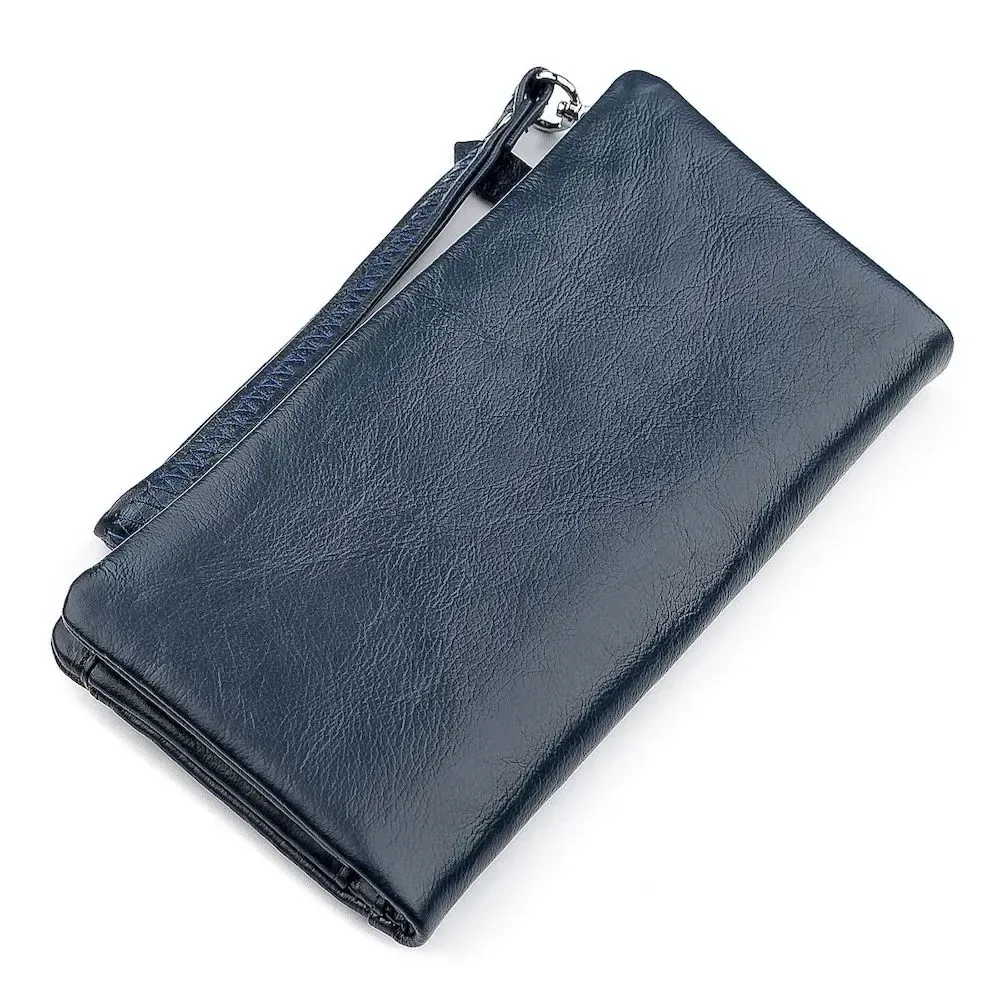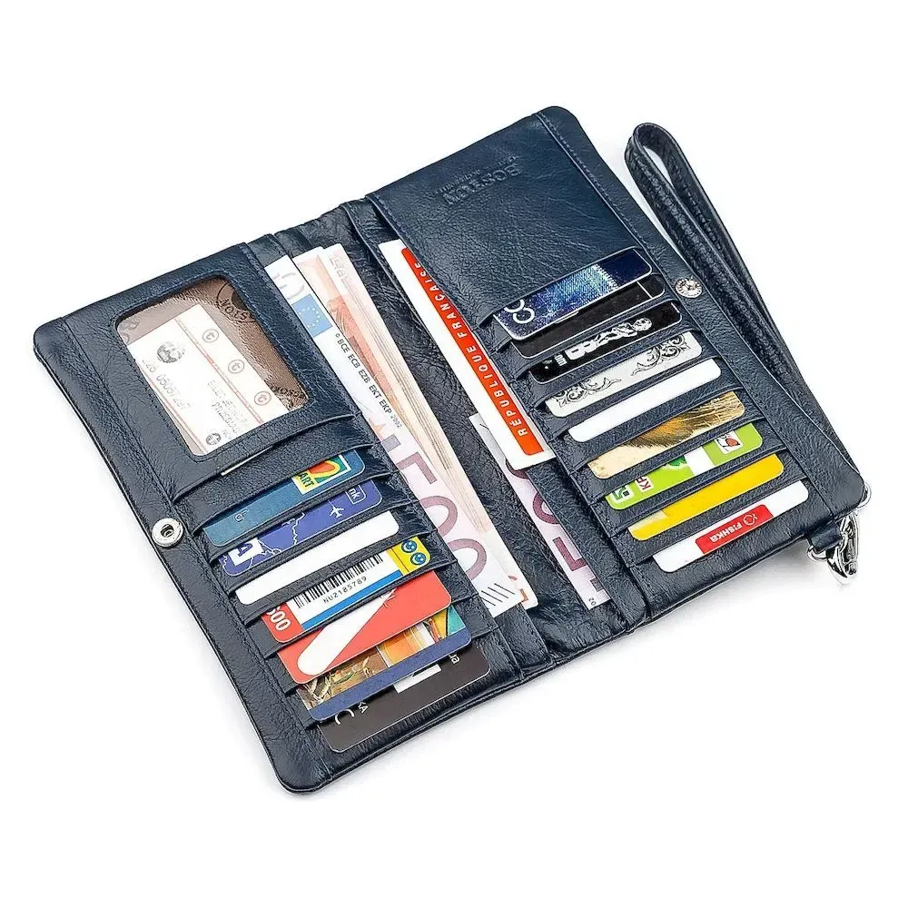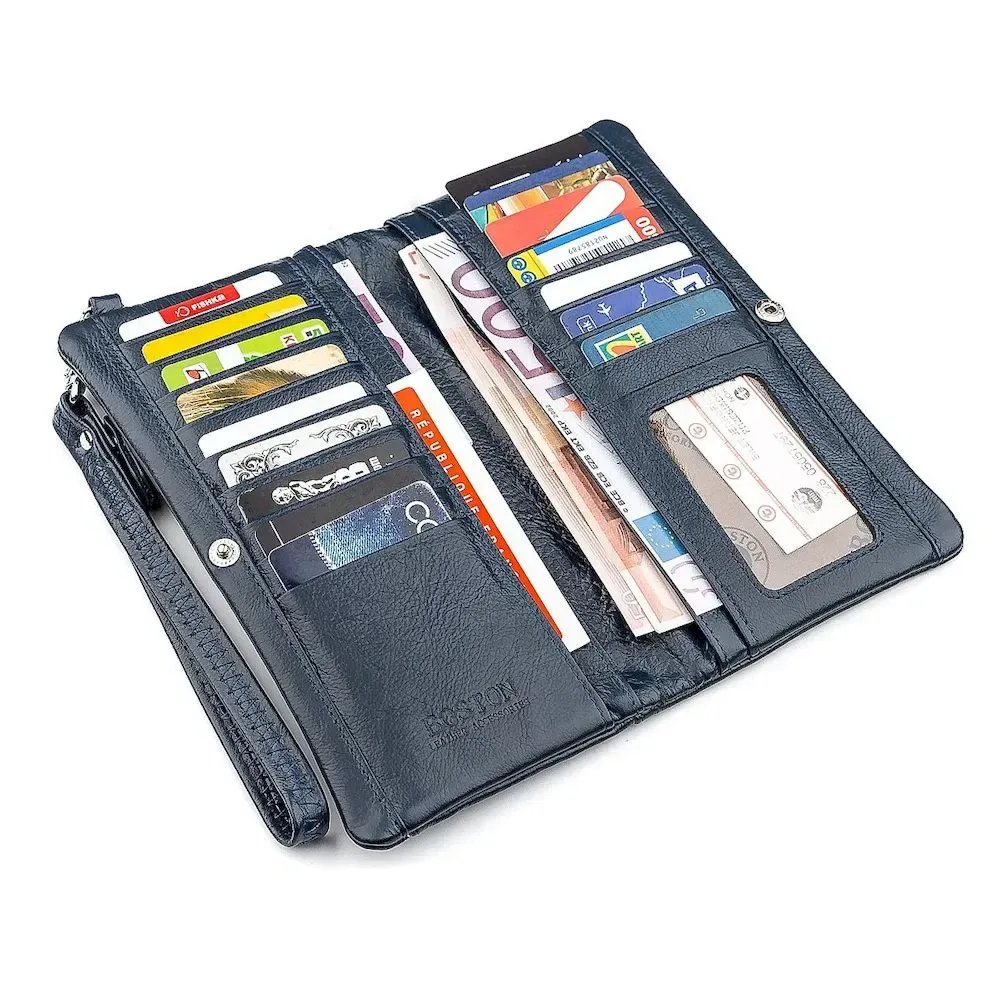 Представленная модель кошелька сшита из качественной и экологически чистой кожи снаружи, а внутреннее пространство оформлено текстилем. Красочный синий цвет подчеркивает индивидуальность и помогает выделить владельца, а внутри расположены большие отделения для бумажных денег и 16 ячеек для банковских и дисконтных карточек. Снаружи есть удобная и просторная монетница, а в комплекте предусмотрен качественный ремень на руку и красивая коробка, благодаря которой можно сделать шикарный подарок родным и друзьям.