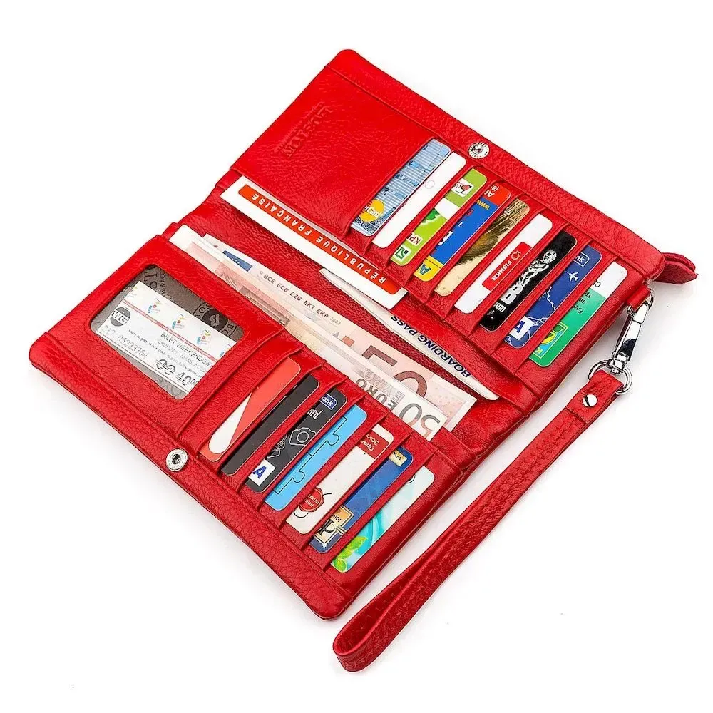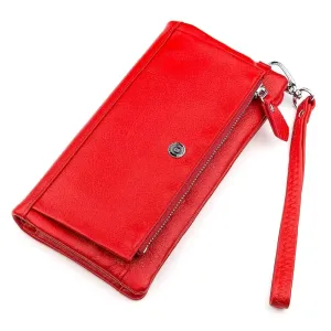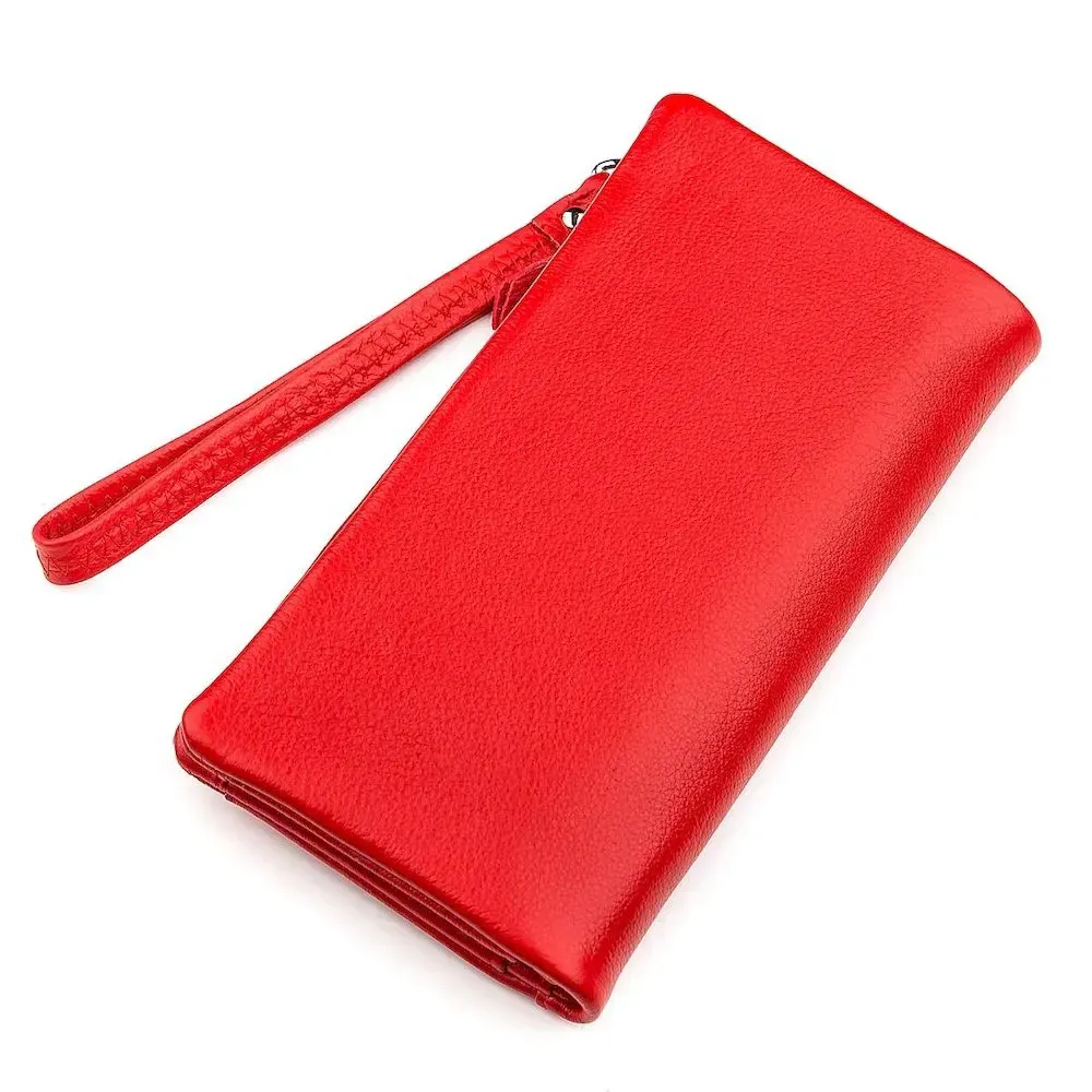 Компактная модель кошелька имеет яркий красный цвет, оригинальный дизайн и удобную фиксацию на кнопку. Внутри есть много места для купюр и 16 ячеек для платежных и дисконтных карточек, с одним прозрачным отсеком для фотографий и документов. На лицевой стороне есть просторная монетница на молнии. Кошелек производится с качественной, износостойкой кожи, а внутреннее оформление текстильное. В комплекте идет удобный ремень на запястье и фирменная подарочная коробка.