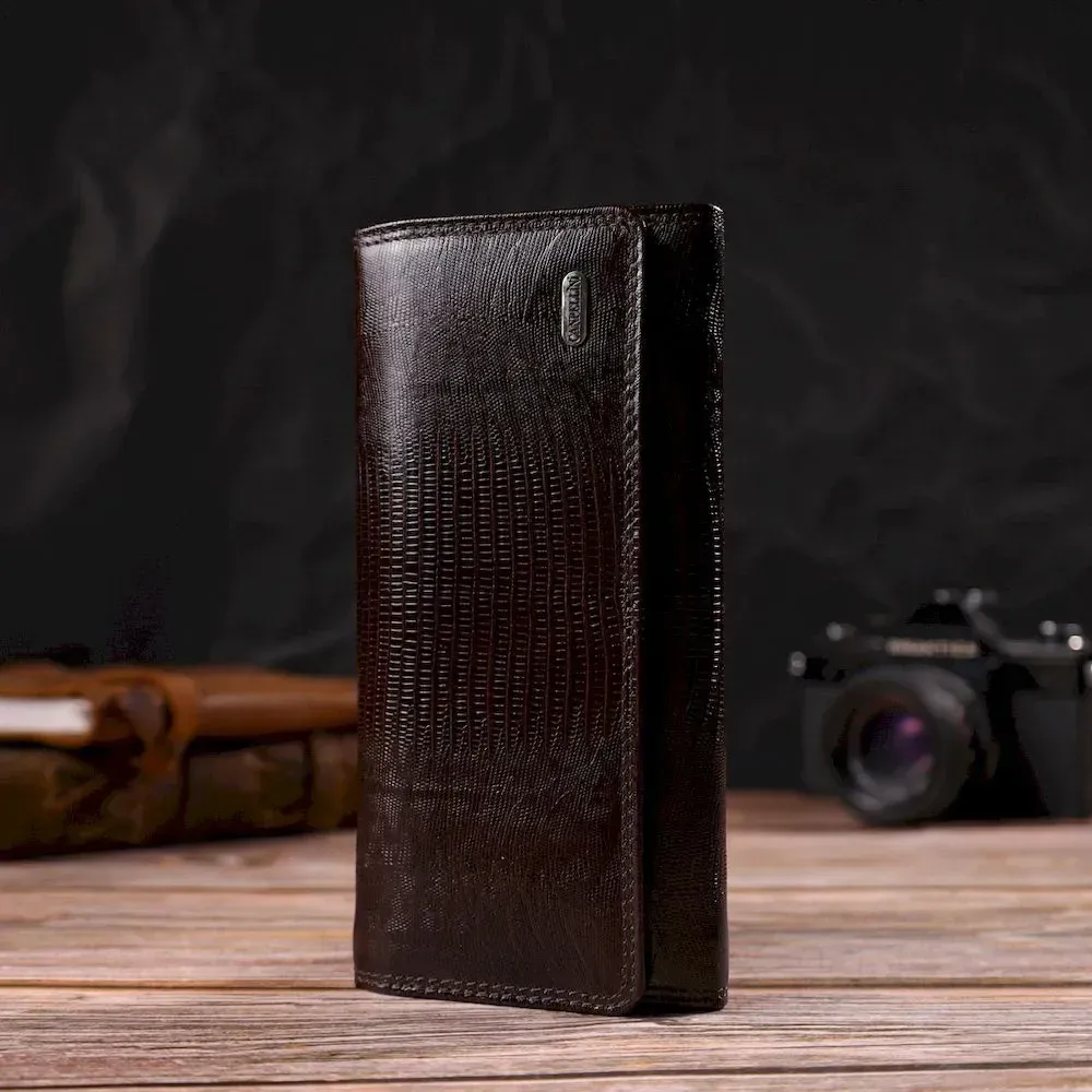 Фактурное женское портомоне горизонтального типа из качественной натуральной кожи с тиснением. Аксессуар имеет три широких отделений для купюр, два кармана на молнии, карман для докумени=тов под сеточкой, один прилегающий кармана и монетницу. Закрывается аксессуар пополам клапаном на кнопку. Приобретая кожаный аксессуар этой фирмы, себе или на подарок, будьте уверены, что он прослужит Вам не один год.