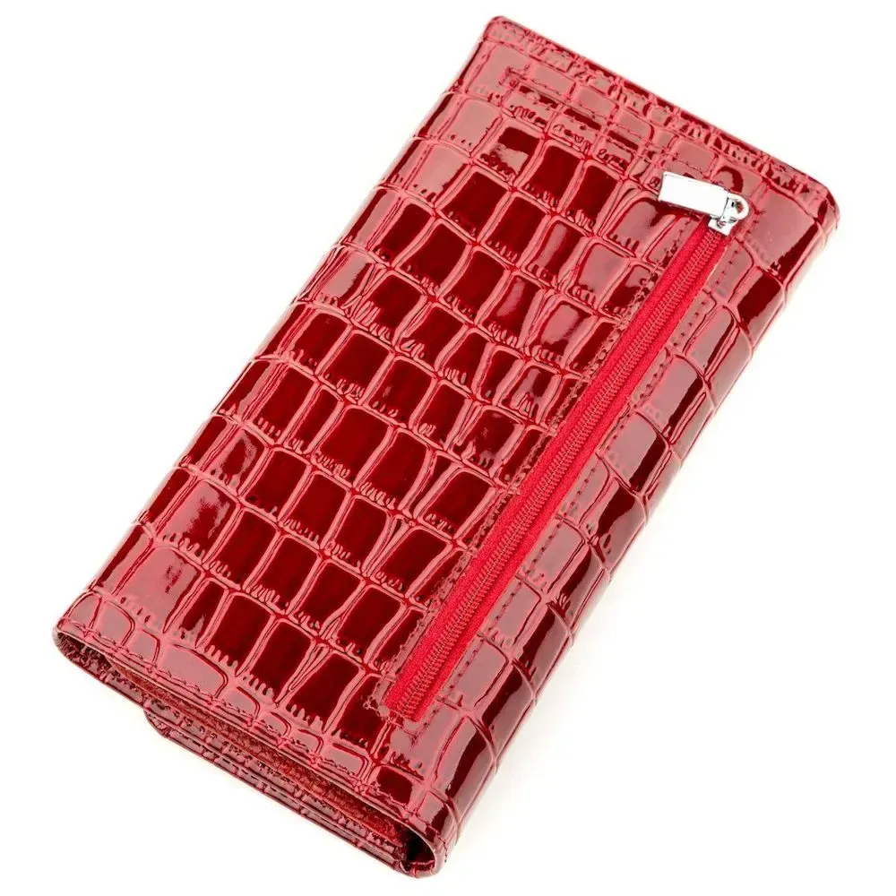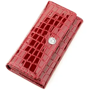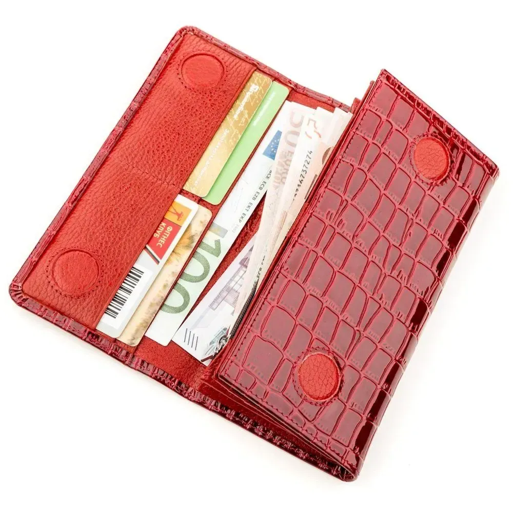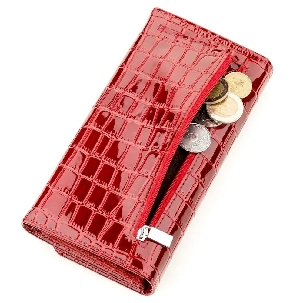 Вместительный и удобный кошелек лаковый красного цвета с тиснением «под крокодил». Закрывается на 2 магнита. Отделения для карточек застегиваются на заклепки. С тыльной стороны есть карман на молнии. Модель имеет достаточно яркий дизайн. Может быть отличным вариантом для подарка и непременно будет по душе его избраннице. В комплекте идет фирменная упаковка.