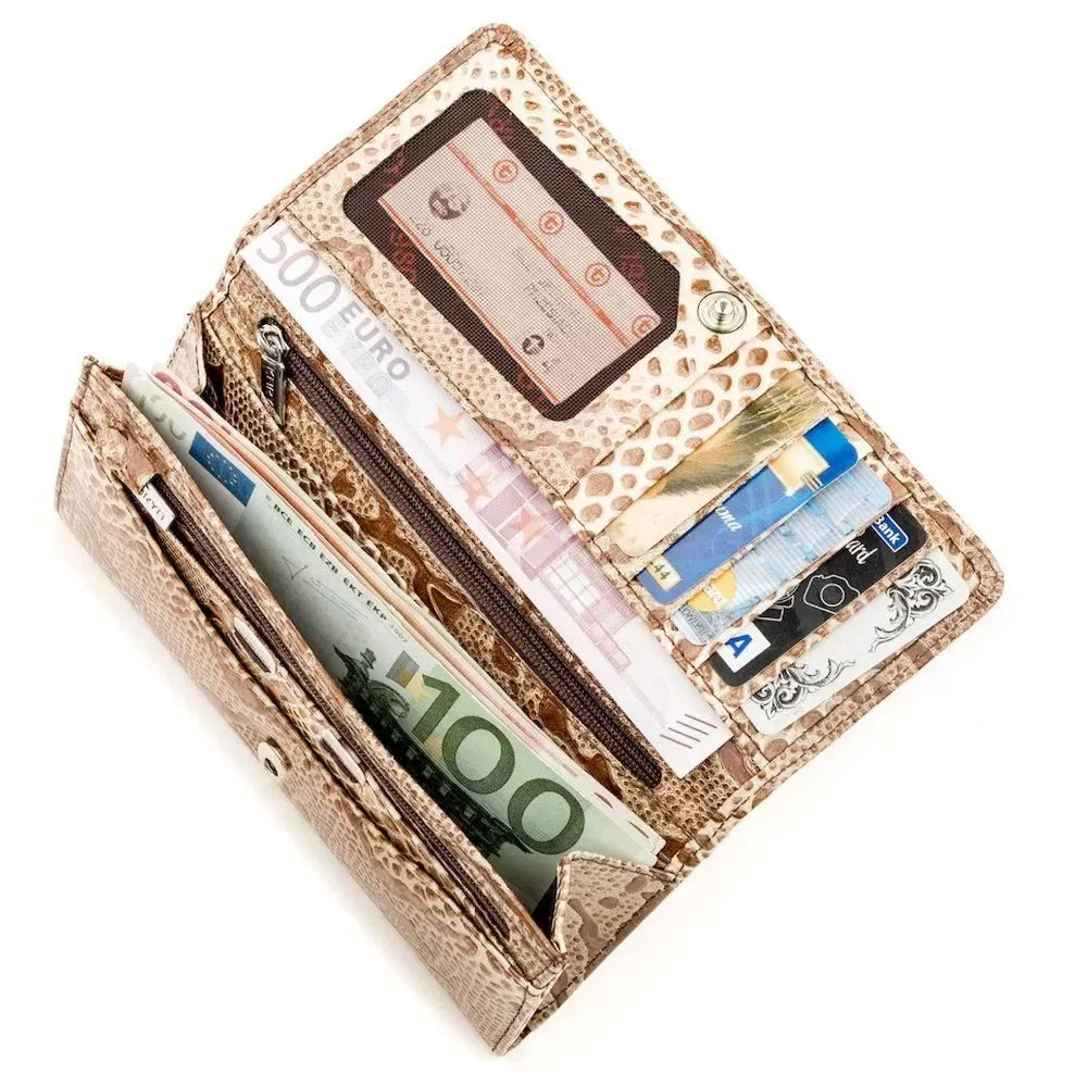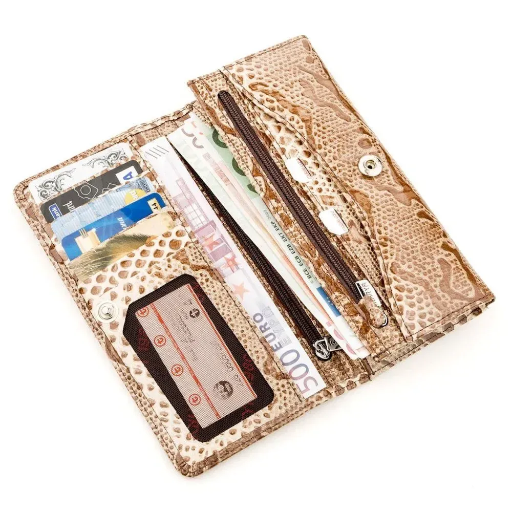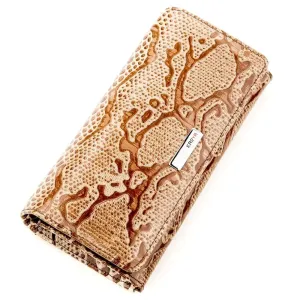 Стильный кошелек из лаково кожи светло-коричневого цвета. Модель имеет оригинальный и непревзойденный дизайн. Аксессуар выполнен под «стиль экзотики». Портмоне долгое время остается в идеальном состоянии. Будет прекрасным вариантом для подарка, а фирменная упаковка станет отличным дополнением.