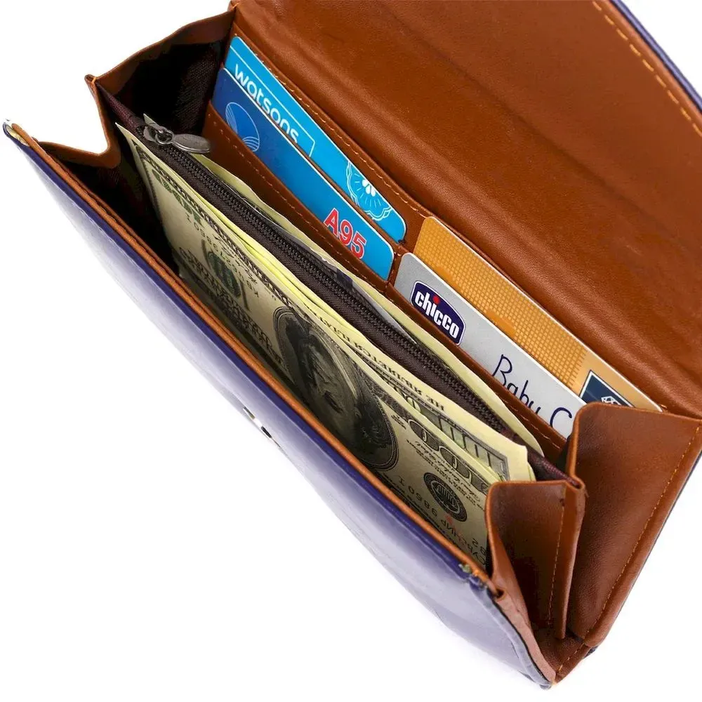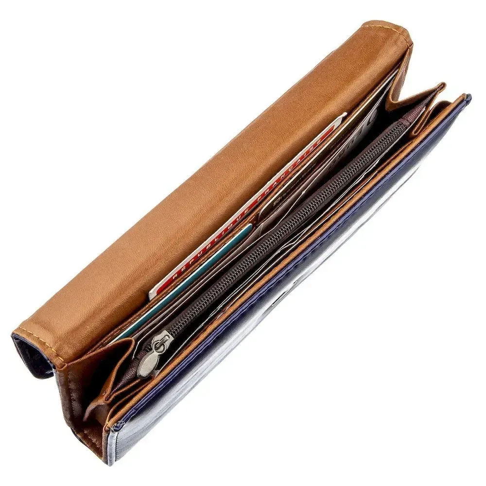 Женский классический тонкий кошелек из гладкой экокожи. Синий цвет кошелька пользуется особенной популярностью у представительниц женского пола. По краям модель прошита ровной строчкой. На внешней стороне – металлический логотип бренда. Внутри аксессуар выполнен из прочного текстиля и экокожи коричневого цвета. Изделие будет прекрасным подарком по любому поводу.