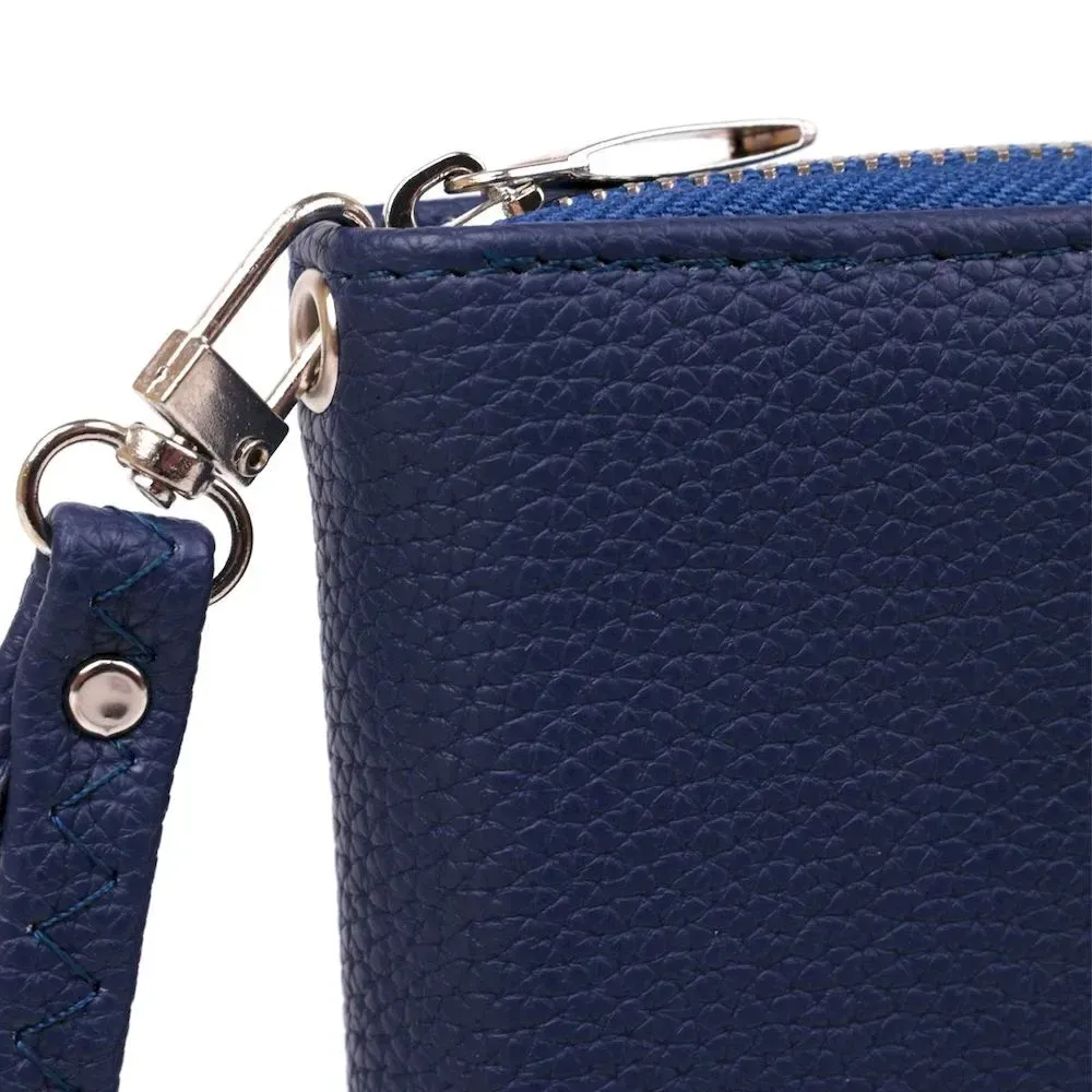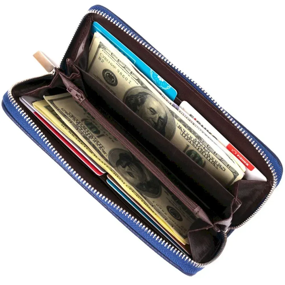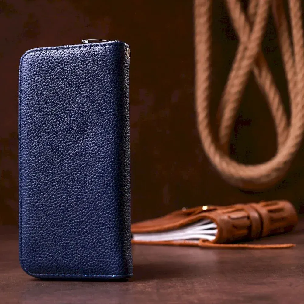 Спокойный синий цвет уже давно завоевал свою популярность наравне с черным и коричневым. Аксессуар выполнен из экокожи с мелкой зернистостью. Такой тип кожи очень хорошо носится и не проблематичен в уходе. По краям аксессуар прошит ровной строчкой в дизайн изделия. Каждая деталь кошелька была продумана опытными технологами для вашего удобства. Внутри аксессуара ремешок-петелька на запястье и ваш кошелек превратится в стильный клатч с которым вы можете пойти на вечеринку. Изделие станет прекрасным подарком для любой девушки.