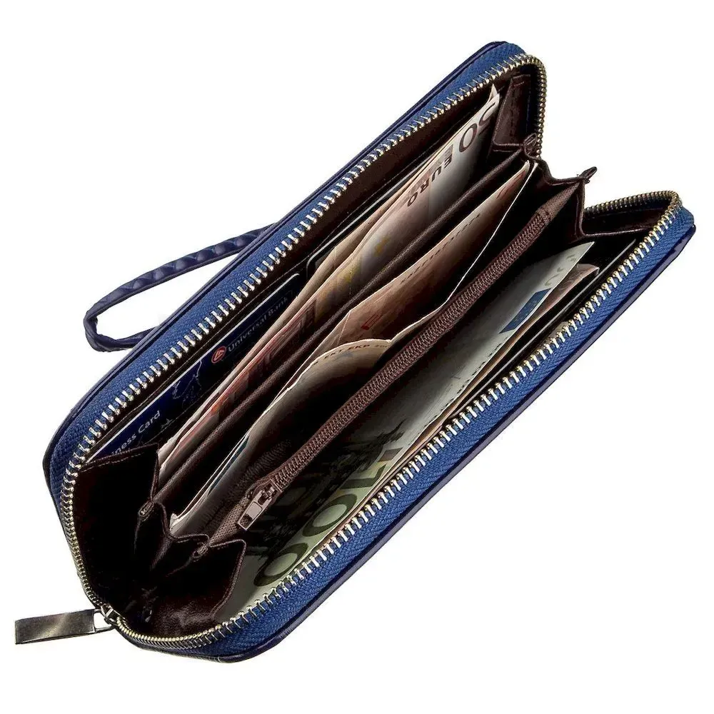 Данная модель – выбор классиков. Выдержанный дизайн и синий цвет в сочетании с доступной стоимостью делают кошелек более привлекательным. Аксессуар подойдет под любой стиль и образ. Вы можете носить данный кошелек как клатч. Выполненная модель в гладкой экокоже, которая будет блестеть на солнце. Внутри кошелек изготовлен из экокожи в сочетании с прочным текстилем. Дополняет дизайн аксессуара металлического лого бренда на лицевой стороне. Новинка уже заслужила свою популярность среди наших клиентов.