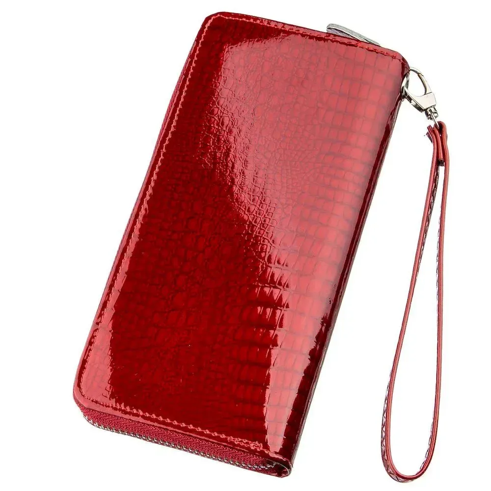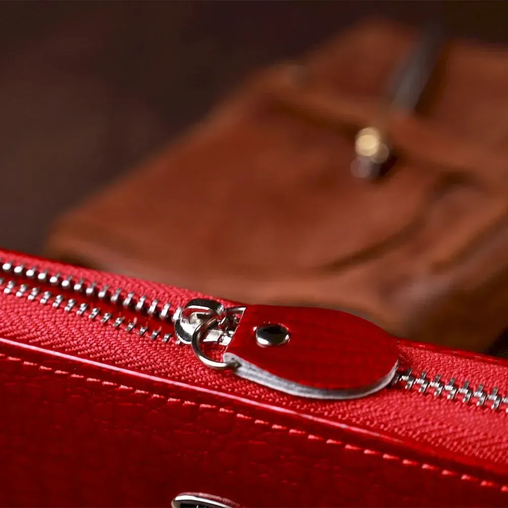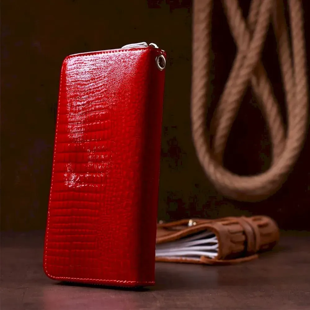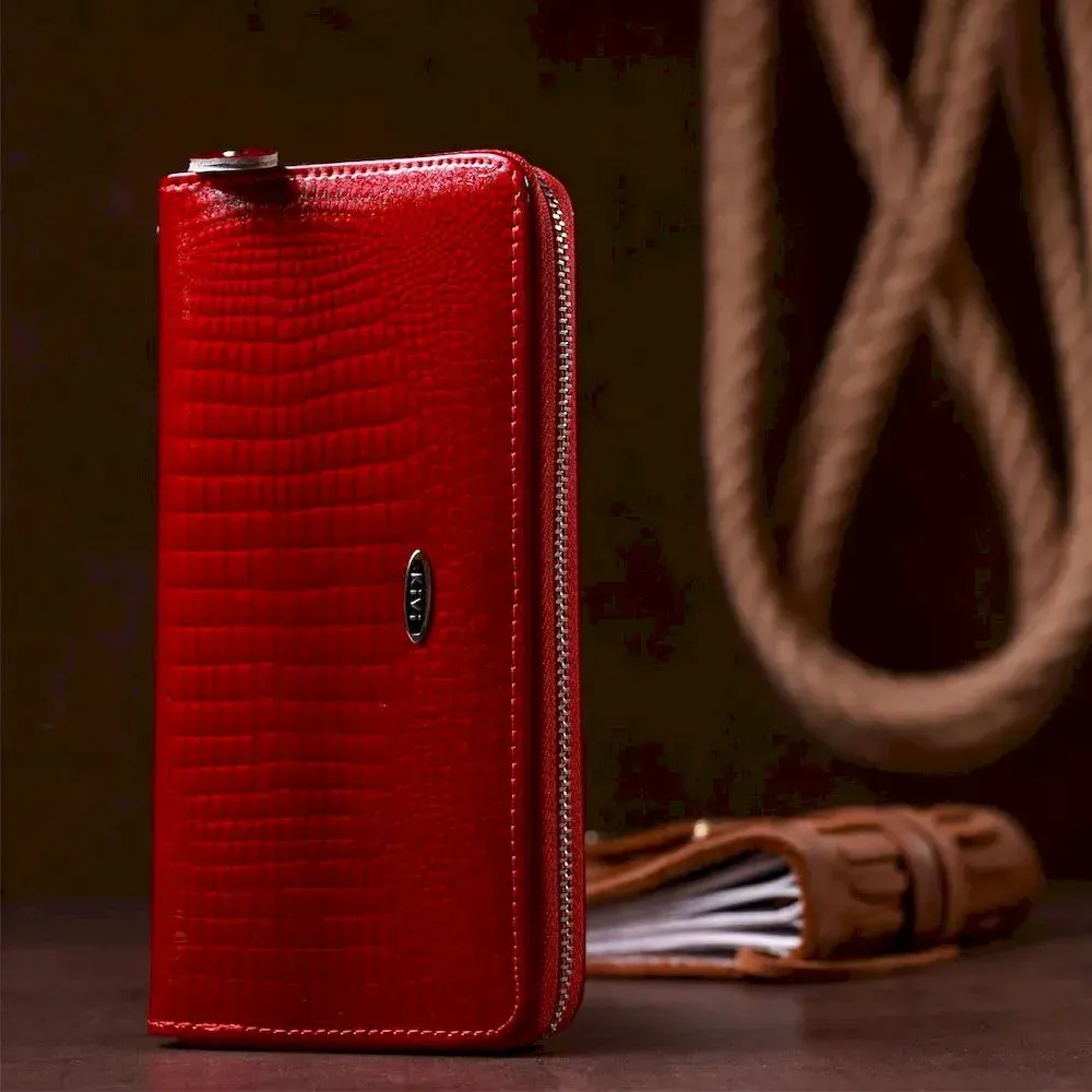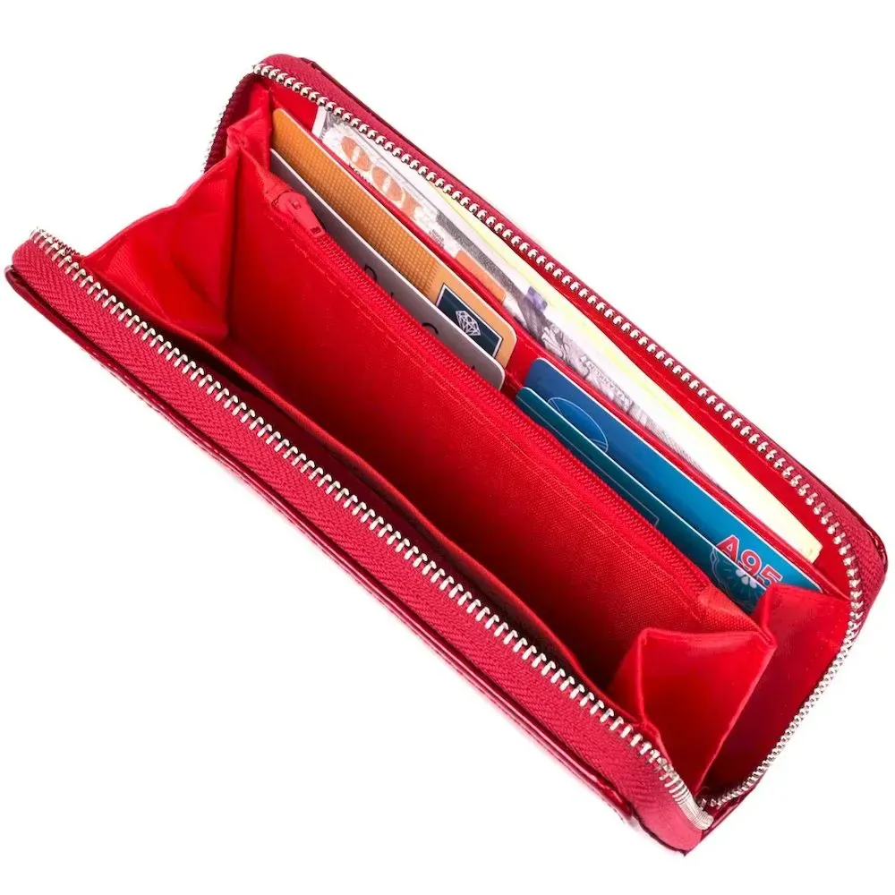Данная модель яркого красного цвета. Изюминкой модели будет то, что аксессуар переливается на солнце. Изделие имеет оптимальный функционал для каждой девушки. В комплекте к кошельку идет ремешок-петелька на запястье. Красный кошелек выделит вас из толпы и подчеркнет ваше чувство стиля. Аксессуар выполнен из экокожи. Внутри изделие изготовлено из экокожи и прочного текстиля. Если вы ищете доступный кошелек советуем присмотреться к этой модели.