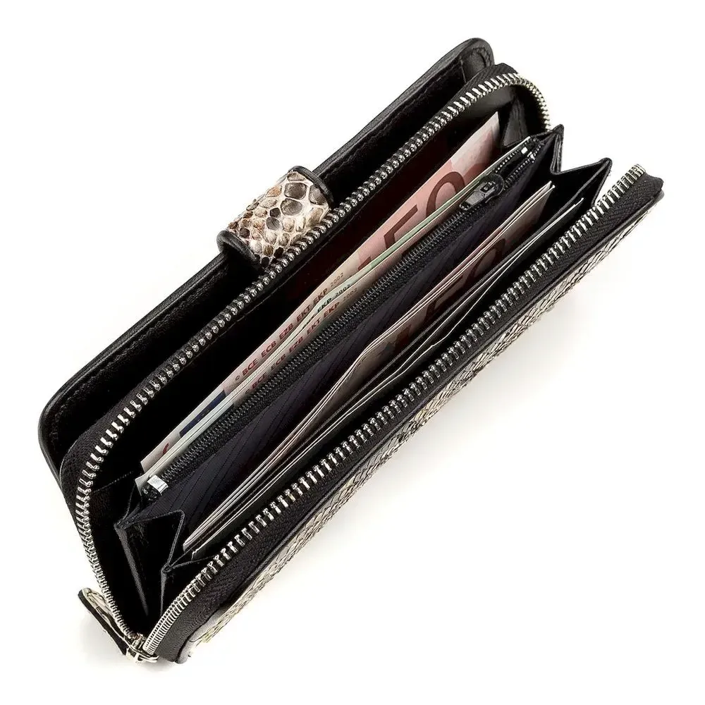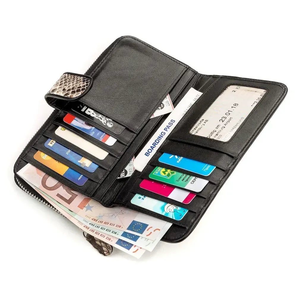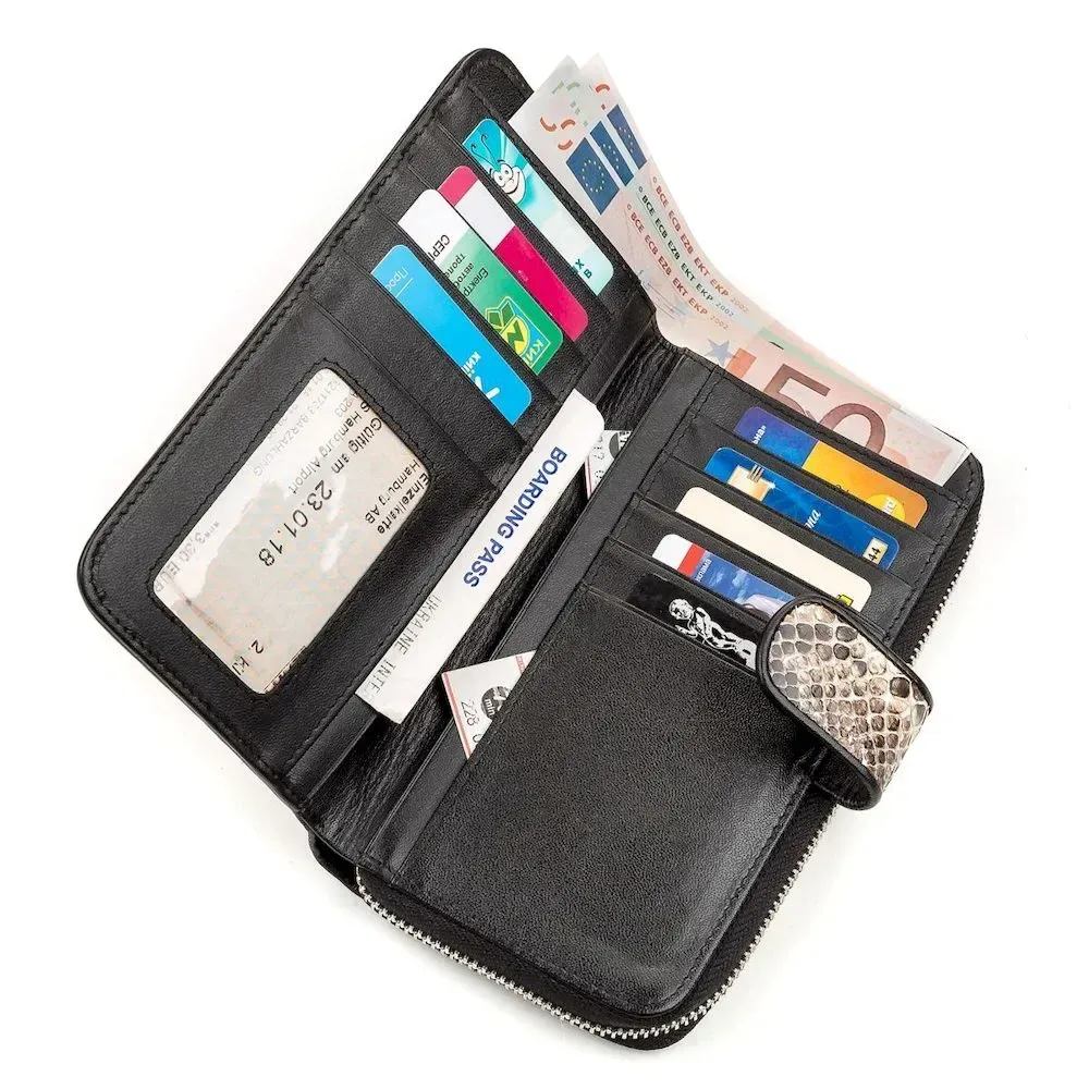 Очень красивый кошелек из натуральной кожи питона, которая обладает фантастической фактурой и красотой. Натуральная кожа питона довольно мягкая и гладкая, приятная на ощупь, она известна своей эластичностью и прекрасными изоляционными свойствами, также характерным признаком натуральной кожи есть наличие чешуек, которые могут отгибаться, создавая хаотичный «рисунок». Такой кошелек очень вместительный, в него легко помещается мобильный телефон, документы и другие мелочи. Отличная идея для подарка, которая не оставит равнодушной ни одну женщину.