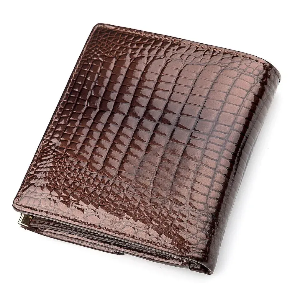 Данный вид кошелька отличается не только небольшими габаритными размерами, но и минимальным набором функционала и фиксацией клапана на кнопке. Кроме того, лицевая отделка декорирована под крокодилью кожу, покрытую лаком, и фурнитурой с золотым напылением. Вместительная монетница расположена снаружи и закрывается на кнопку. Внутренний функционал имеет минимальный набор необходимых отделений: для купюр, документов и кредиток. Продажа данной модели осуществляется в комплекте с фирменной упаковочной коробкой.