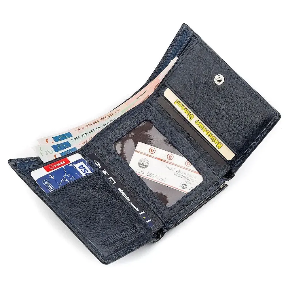 Модель компактного женского аксессуара, который может вместиться в любой дамской сумочке. Конструкция кошелька складывается в три раза, при этом клапан застегивается на специальную кнопку. Каждая представительница прекрасного пола непременно оценит функционал данной модели: отсеки для купюр, ячейки для кредиток и обязательно монетница. Кошелек изготовлен из качественной натуральной говяжьей кожи и серебристой надежной фурнитуры. В нашем интернет-магазине вы можете купить понравившуюся модель женского кошелька по цене, которая вас приятно удивит.