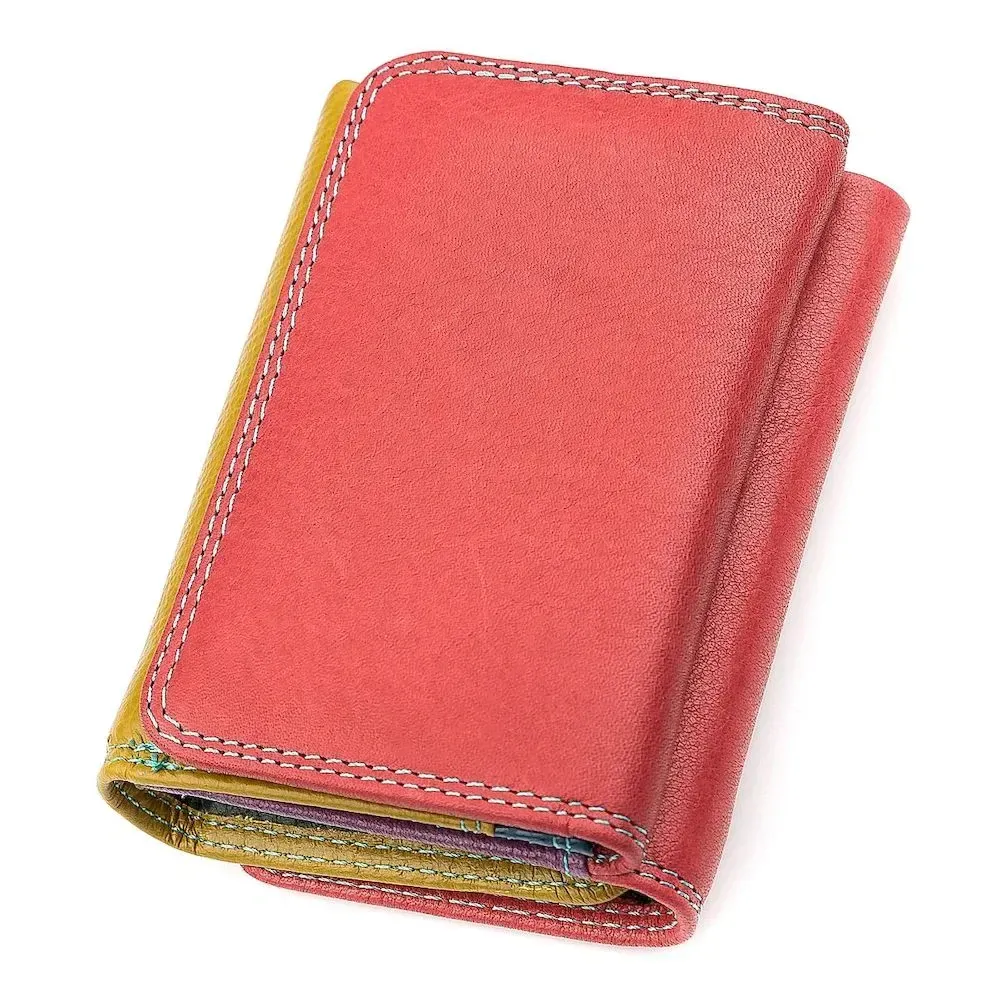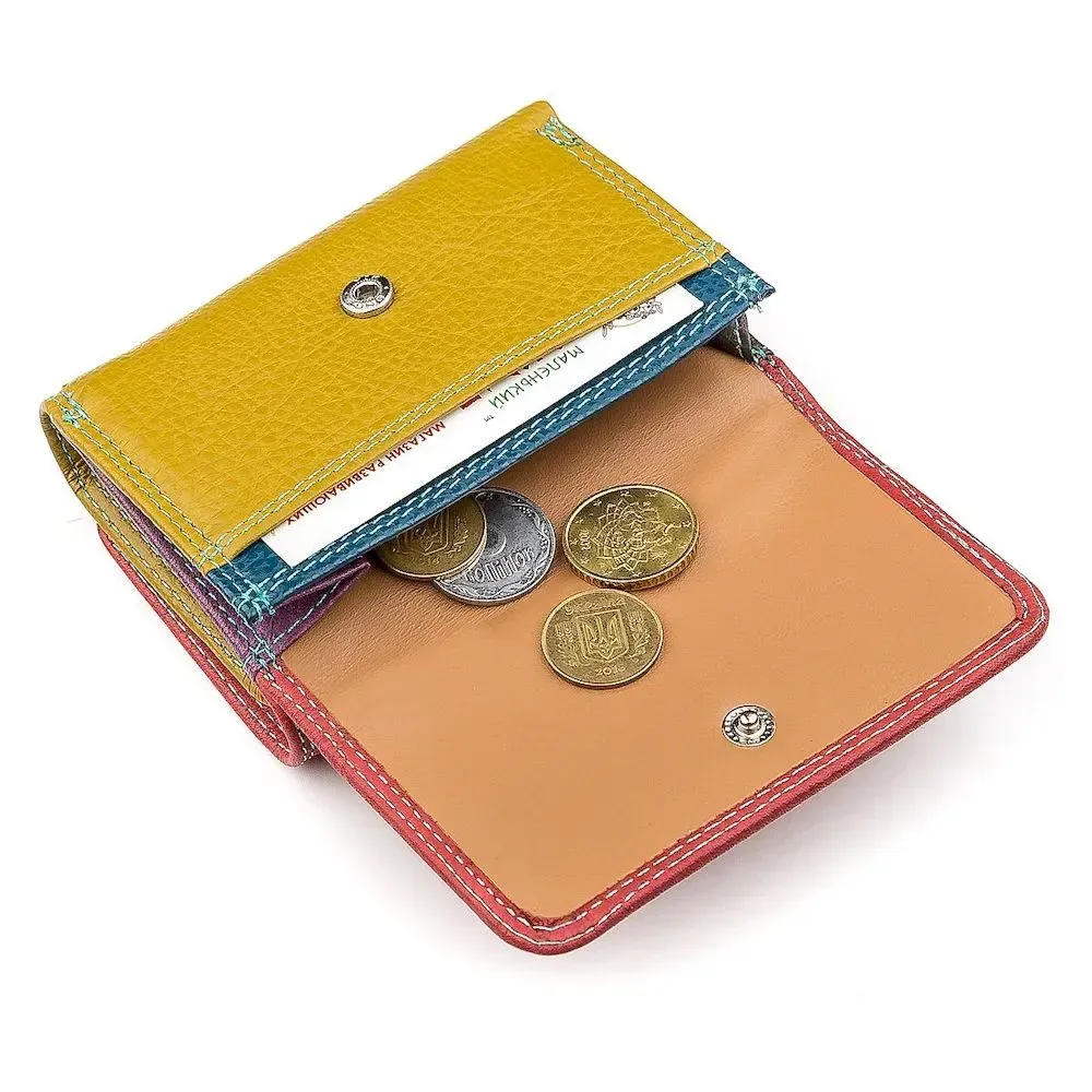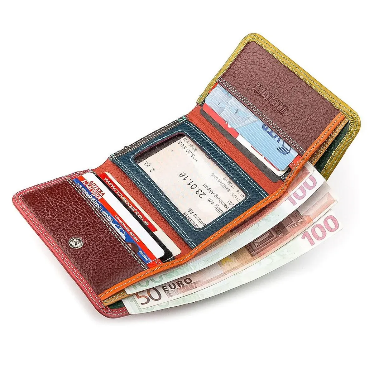 Последняя модель COLORFUL LINE объеденила в себе смелые цвета и удобный функционал, что делает изделие оригинальным и красивым. Кошелек складывается в несколько раз и фиксируется на специальную кнопку. На внутреннем развороте есть два отсека для бумажных денег и несколько слотов для кредиток. Также, внутри аксессуара предусмотрено специальное онко для хранения документов или фото. С наружи расположена внушительная монетница.