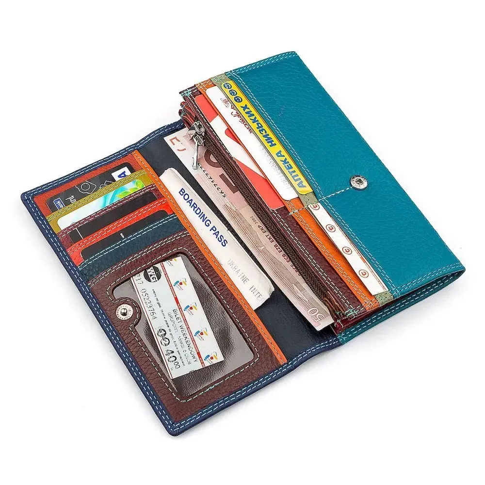 Модель оригинального дизайна, оформлена яркими цветными вставками, закрывается с фиксацией на кнопку. Внутри сосредоточен весь необходимый функционал. Для бумажных денег есть три секции, в перегородках между ними вшиты карманы на молнии. Для пластиковых карточек предусмотрено семь ячеек, есть два широких прилегающих кармана. Снаружи на обороте есть дополнительный карман на молнии. Аксессуар выполнен из натуральной кожи (в перегородках используется свиная кожа, в стенках текстильный подклад). Кошелек доставляется в коробочке.