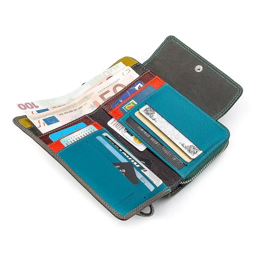 Привлекательность данной модели кошелька обеспечивается благодаря сочетанию серого и зеленого цвета при стильном соединении кусочками натуральной и экологически чистой кожи. Снаружи аксессуар отделан с говяжьей, а внутренние перегородки со свиной, дополняемые текстильной подкладкой. Вместительность кошелька отличная – есть карманы широкие, глубокие и скрытые, позволяющие комфортно размещать ценности, карточки и банкноты. Для монет есть отделение на молнии, а также в комплектацию входит ремешок на запястье и красивая коробка.