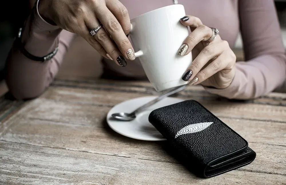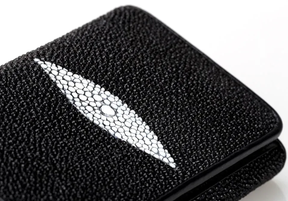 Красивый женский кошелек из натуральной кожи морского ската, которая обладает фантастической фактурой и красотой. Ее изящество подчеркивает костяной остаток от спинного плавника, похожий на блок “жемчужин”. Самая крупная “жемчужина” находится по центру, и по ней определяют возраст ската. Все пространство кожи покрыто сотнями мелких бугорков, разного размера, которые играют на свету, как небольшие бусинки. Очень компактный и износоустойчивый аксессуар, который подойдет всем ценителям удобства и качества.
