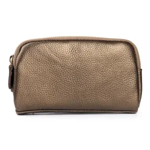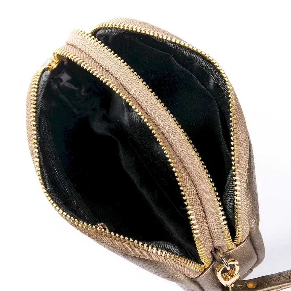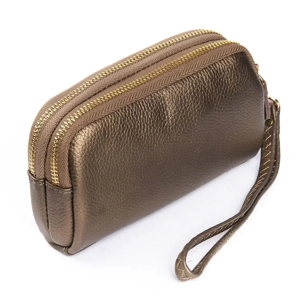 Женский кожаный кошелек-косметичка. Два отделения которые закрываются на молнии. Внутри отделений есть один карман на молнии и один открытый карман. В комплекте сьемный кистевой ремешок. Размер (см.) 16*9*5