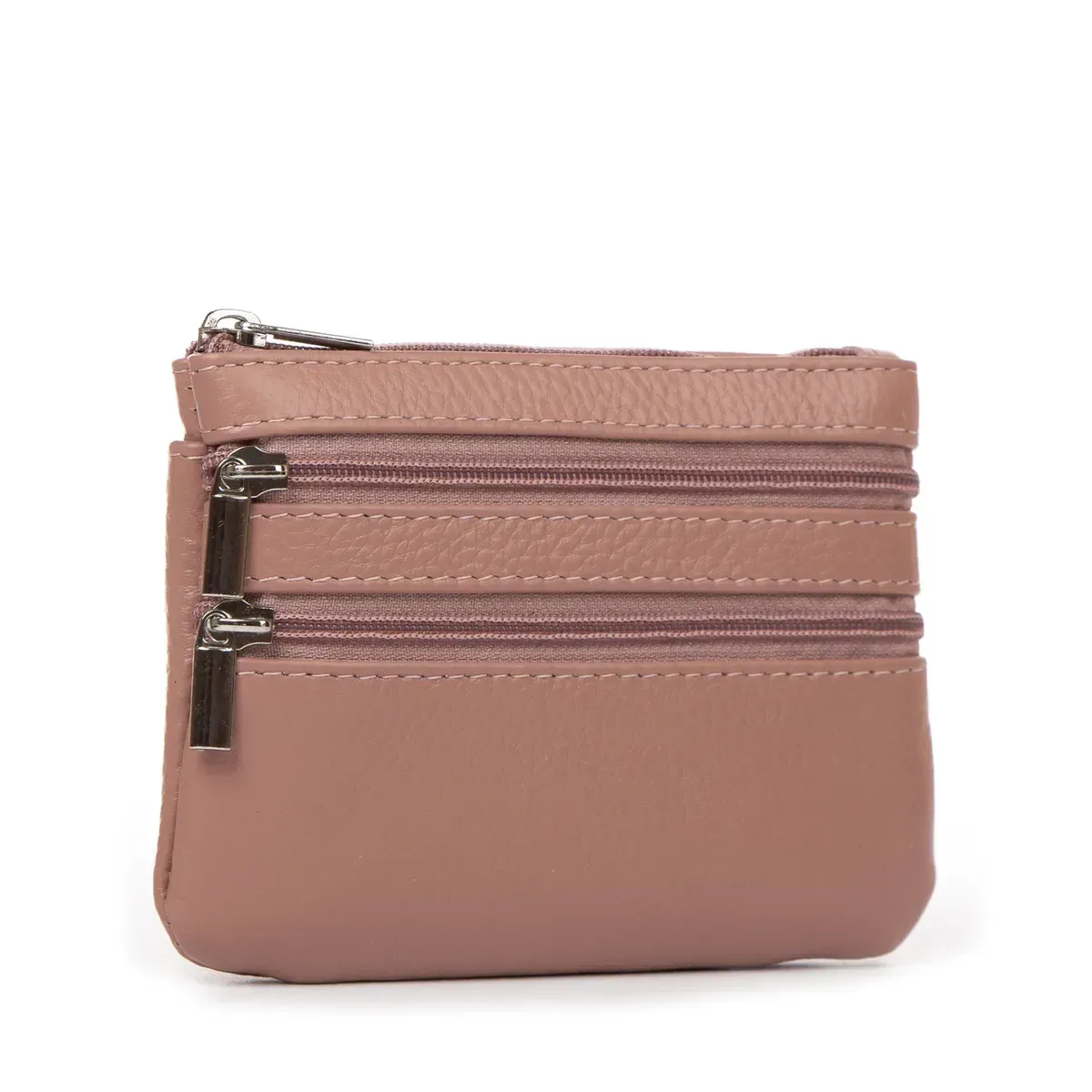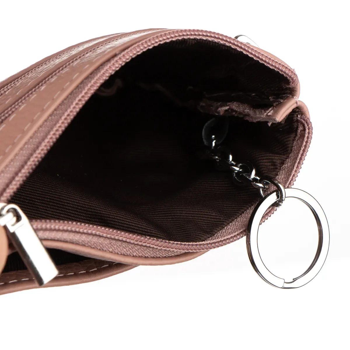 Женская кожаная косметичка - ключница. Одно отделение для ключей, закрывается на молнию. На фасаде расположены два кармана на молнии, а на обратной стороне один открытый карман.